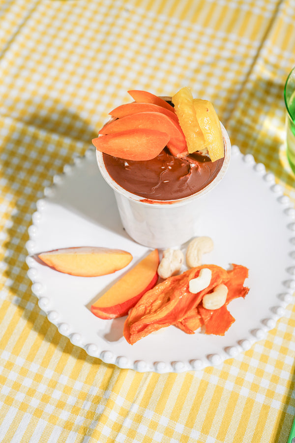 Breakfast yogurt with chia, chocolate layer, mango, nectarine, and pineapple