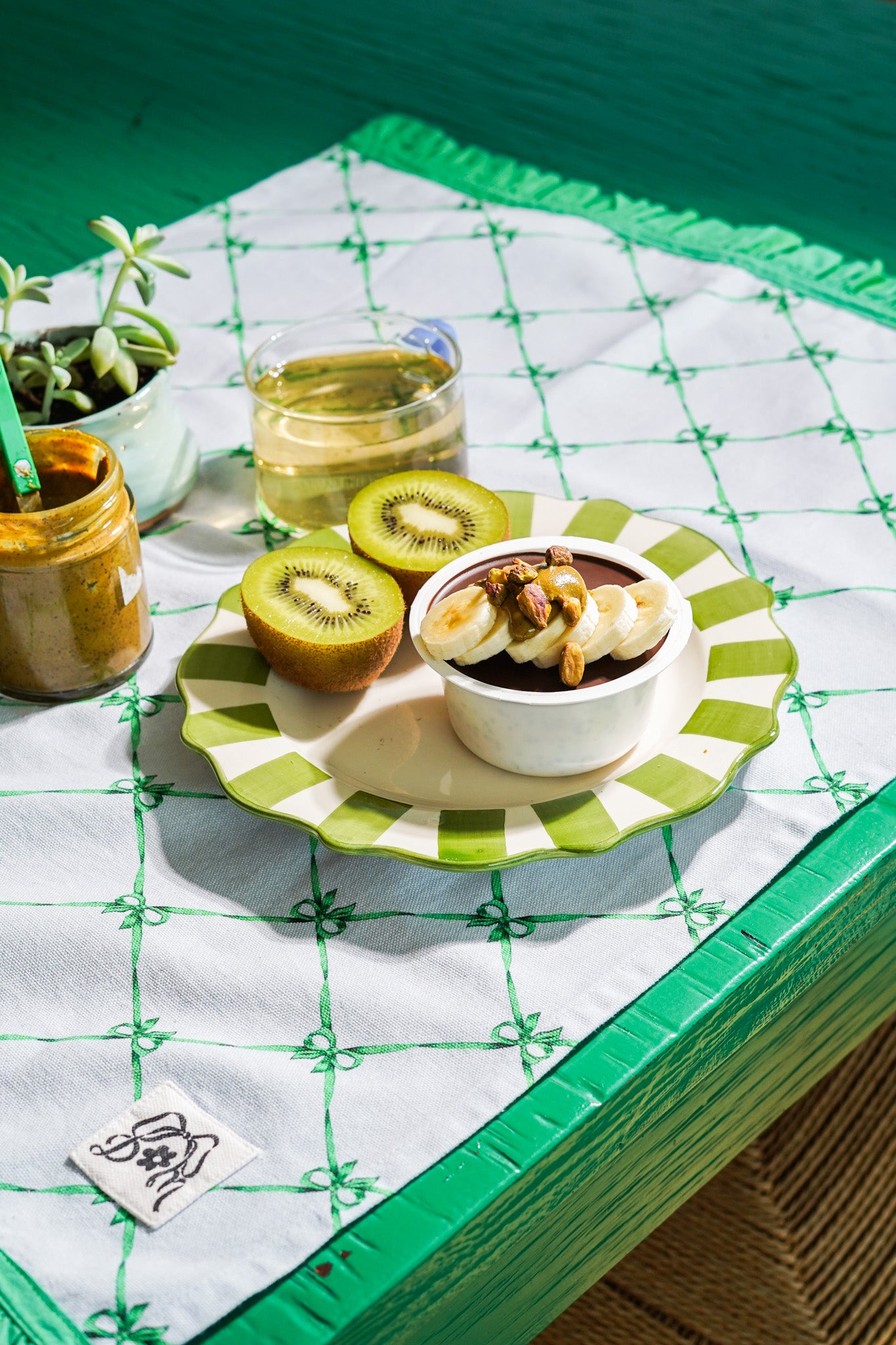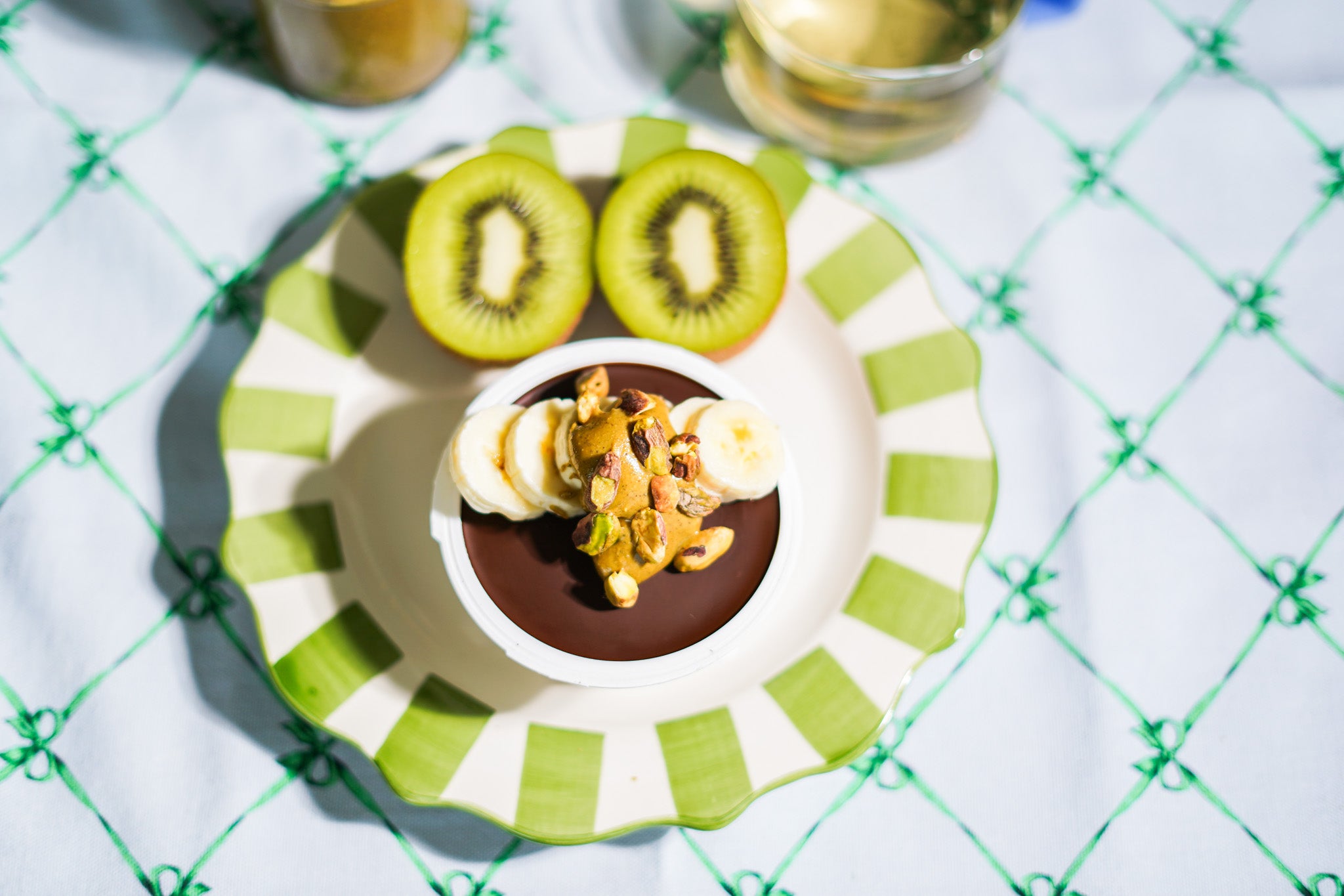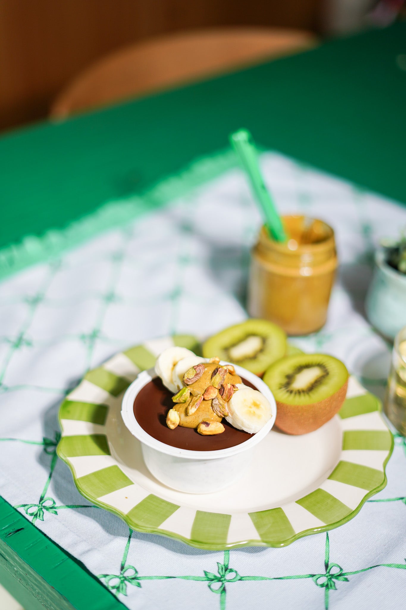 1 banana 2 teaspoons pistachio butter 2 teaspoons pistachios, coarsely chopped Handful of mixed nuts (optional, for extra filling and protein) 2 kiwis