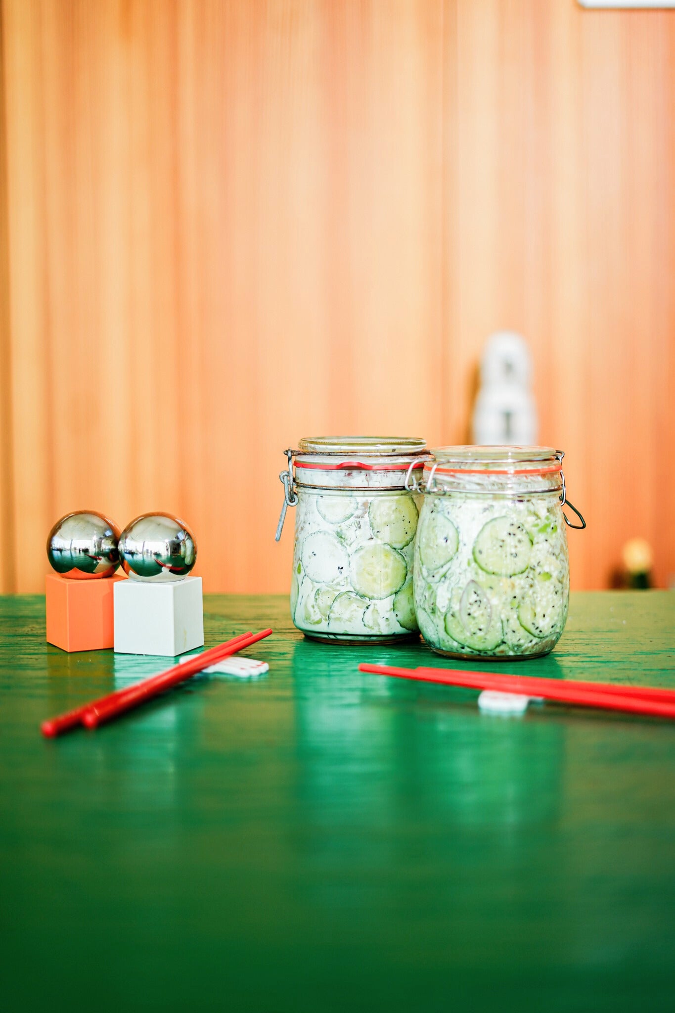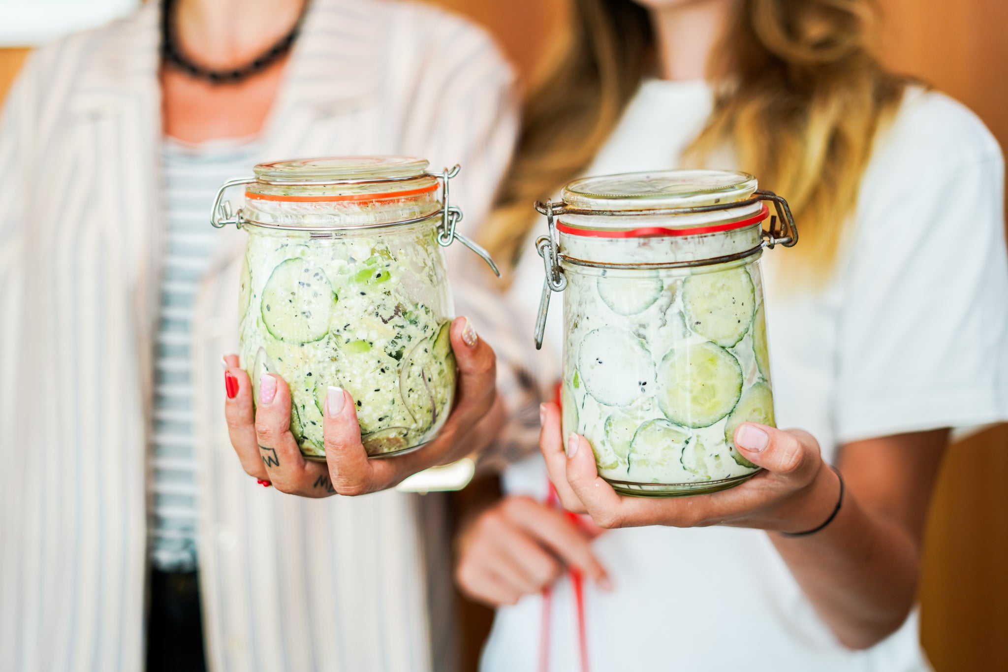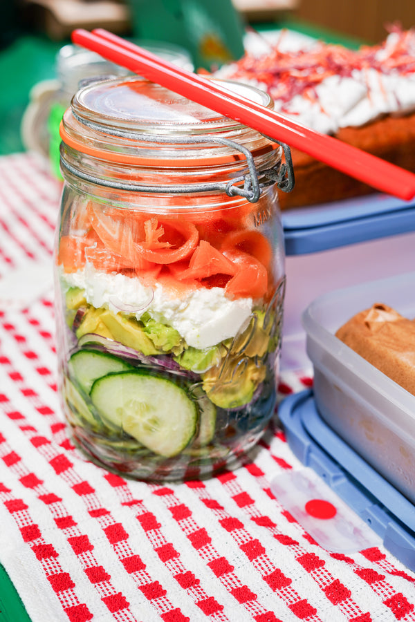 Cucumber salad with smoked salmon, avocado, and cream cheese in a jar