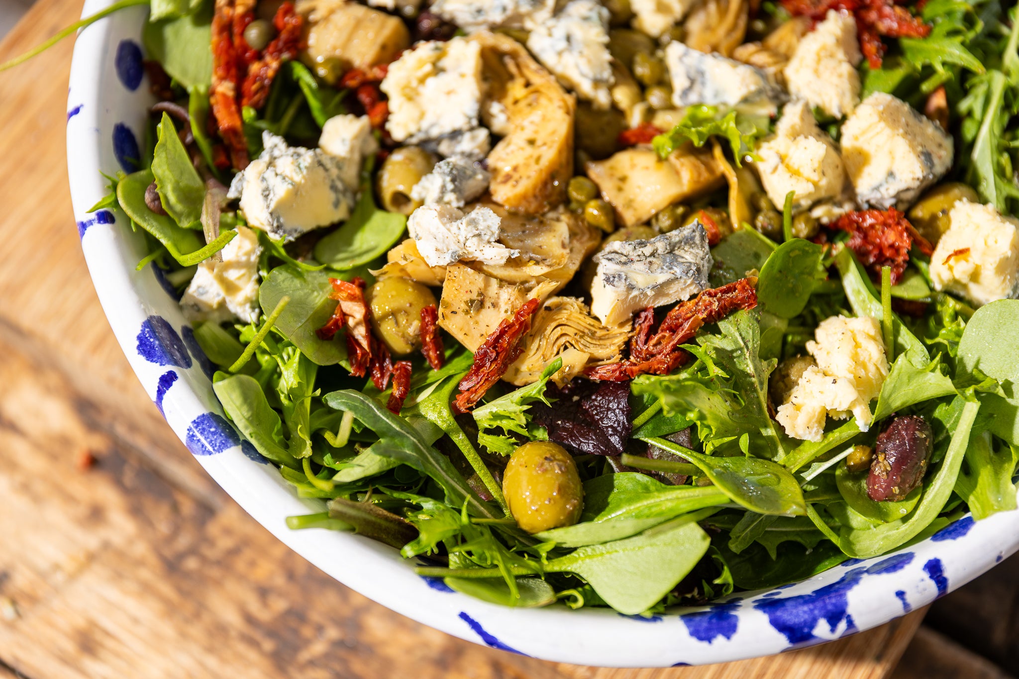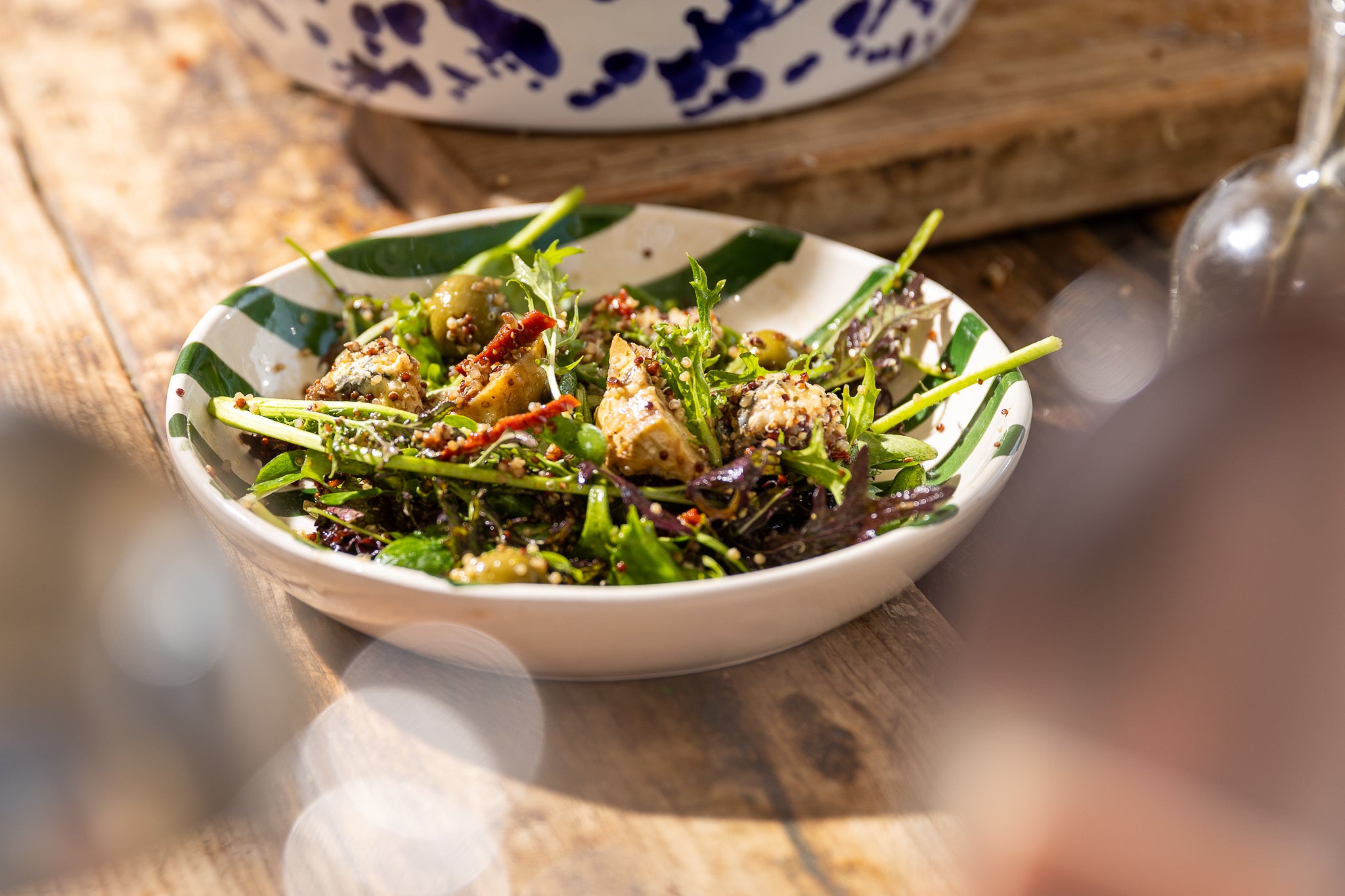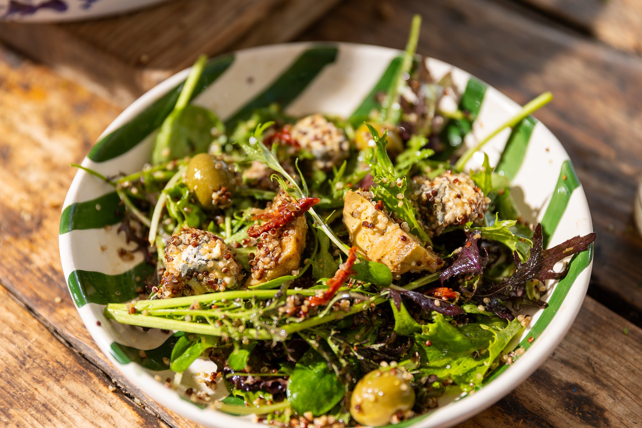 Mediterranean salad with quinoa, sun-dried tomatoes, olives, and artichoke