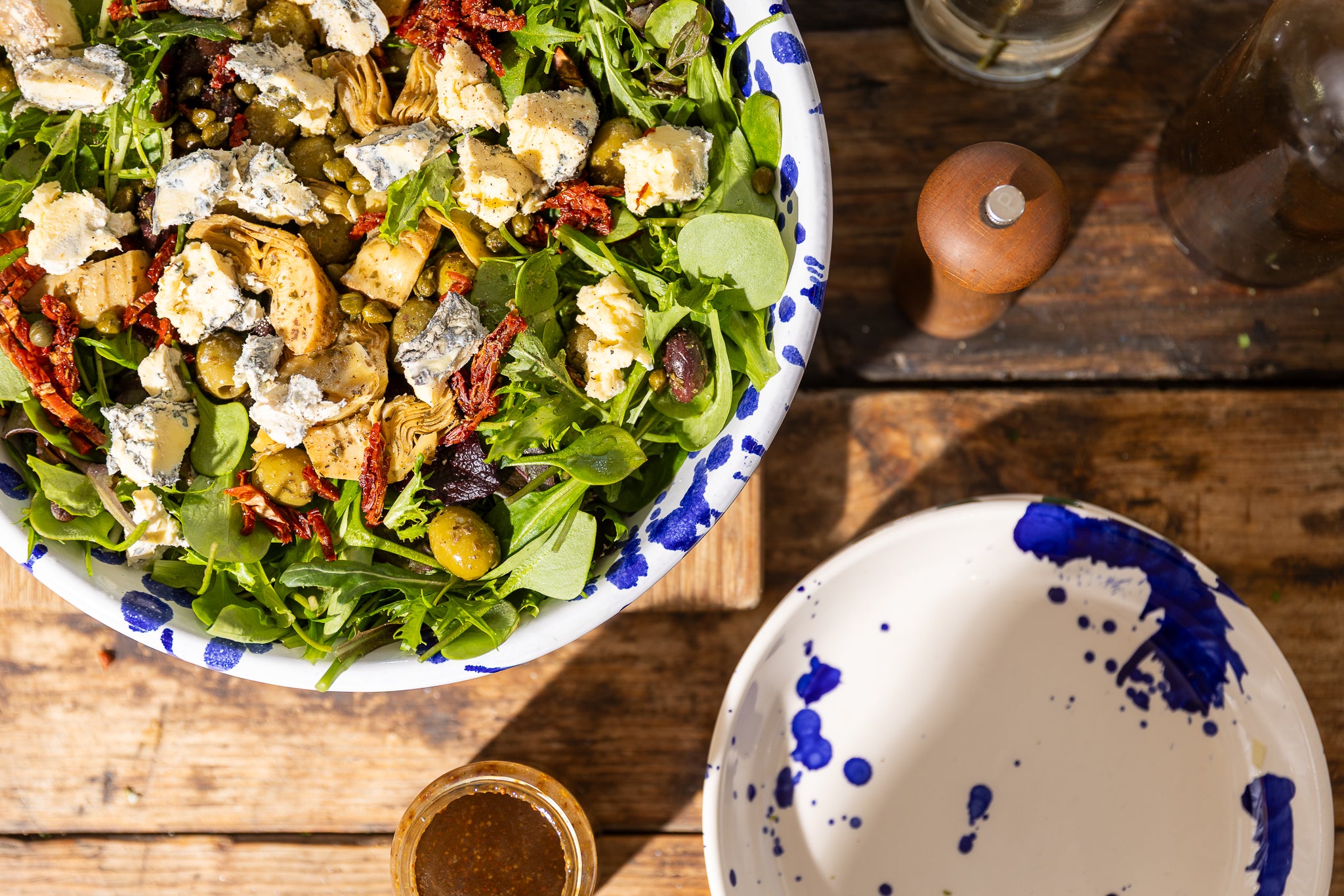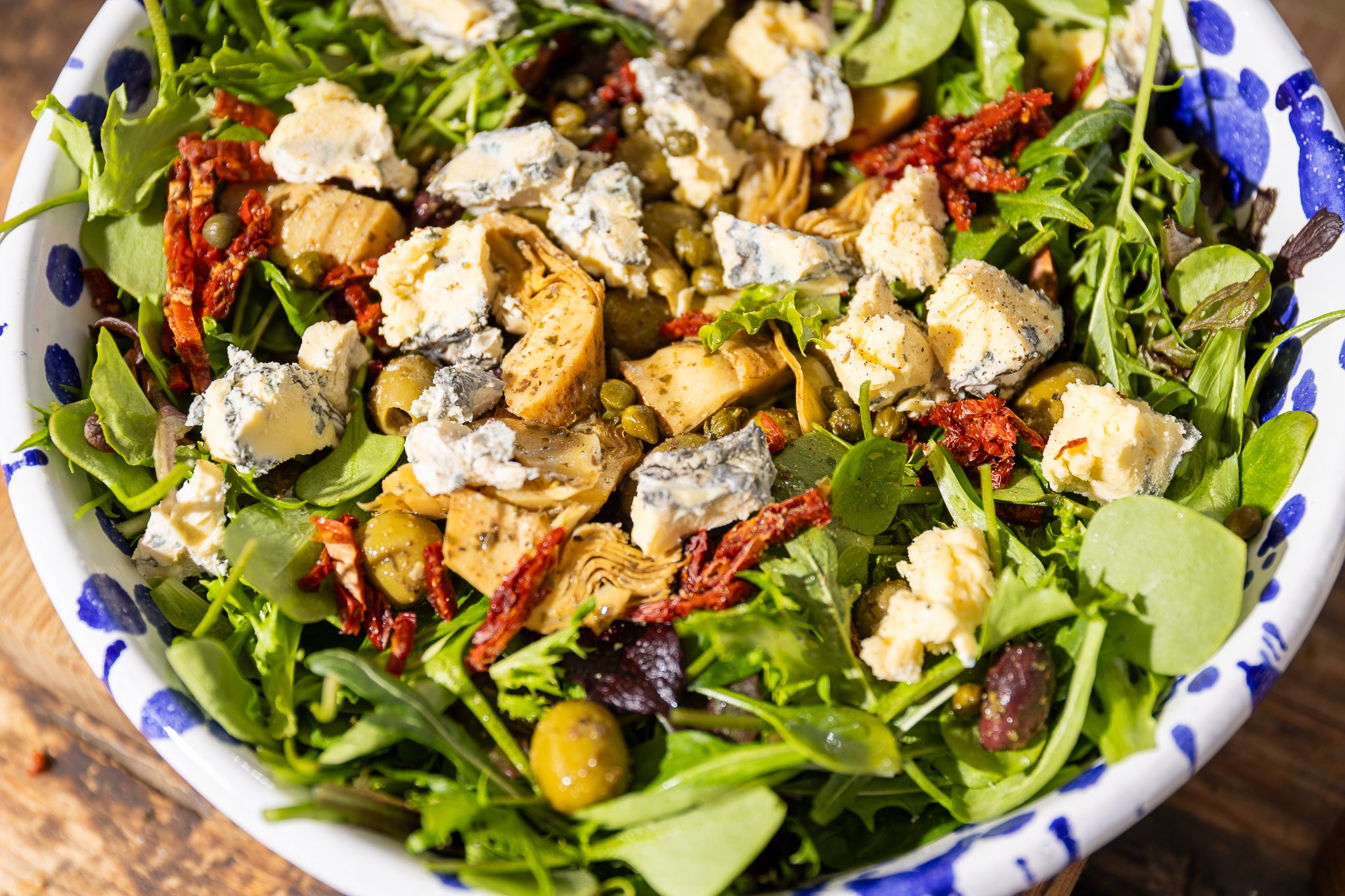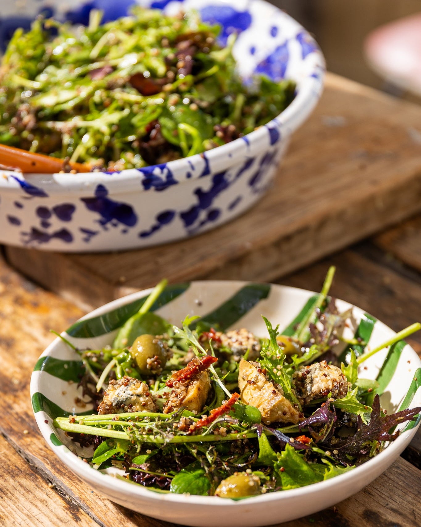 Mediterranean salad with quinoa, sun-dried tomatoes, olives, and artichoke