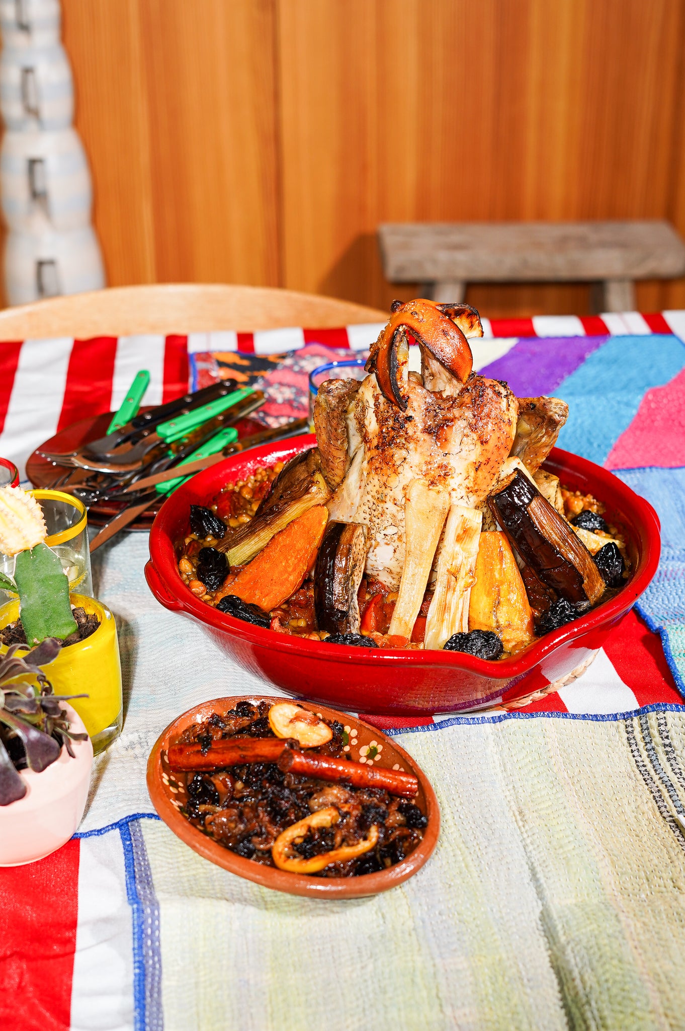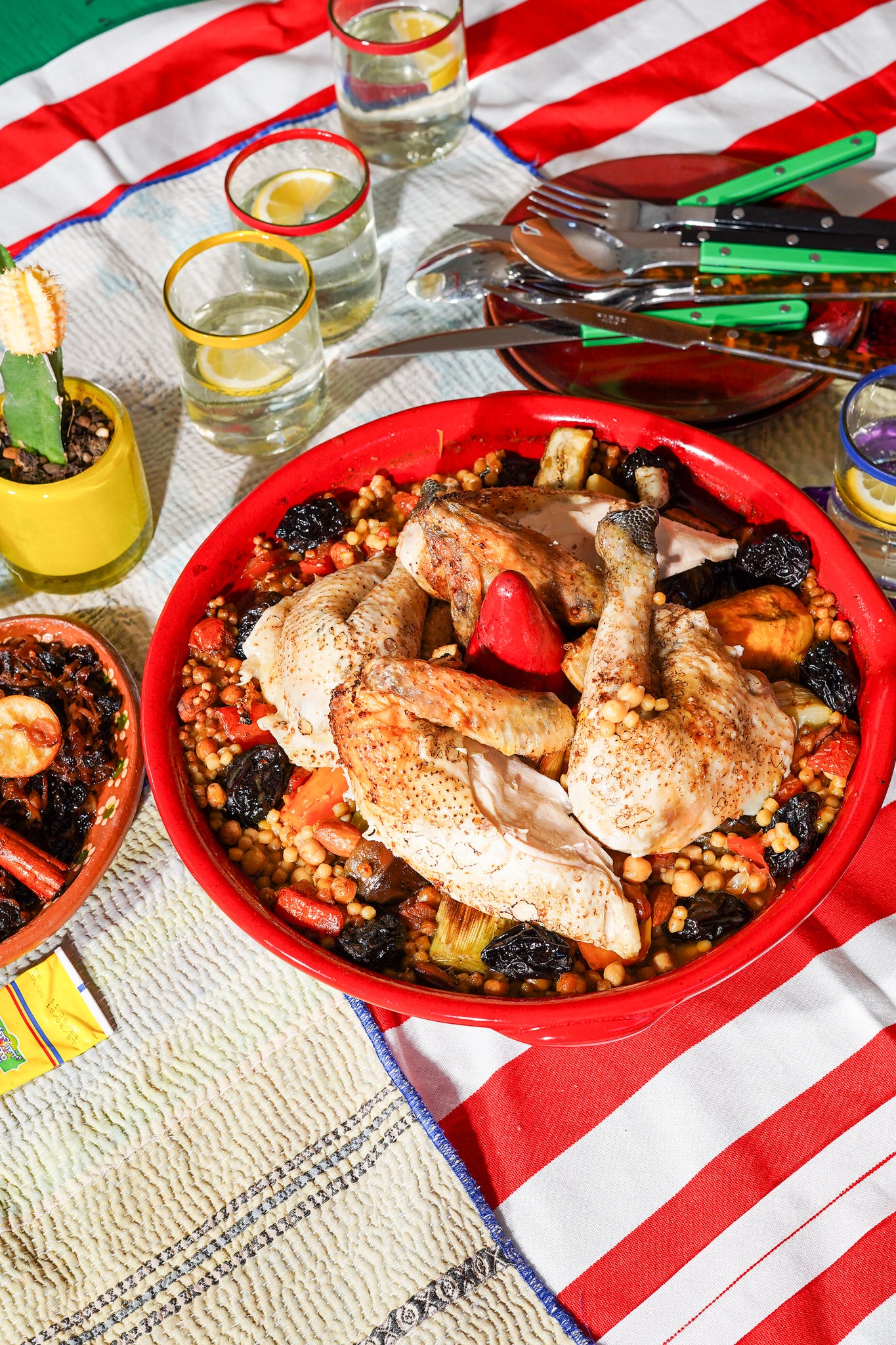 Squeeze the lemon over everything. Remove the chicken, cut off the thighs and breast, and arrange them over the casserole with vegetables and pearl couscous. Serve with the caramelized onion on top.