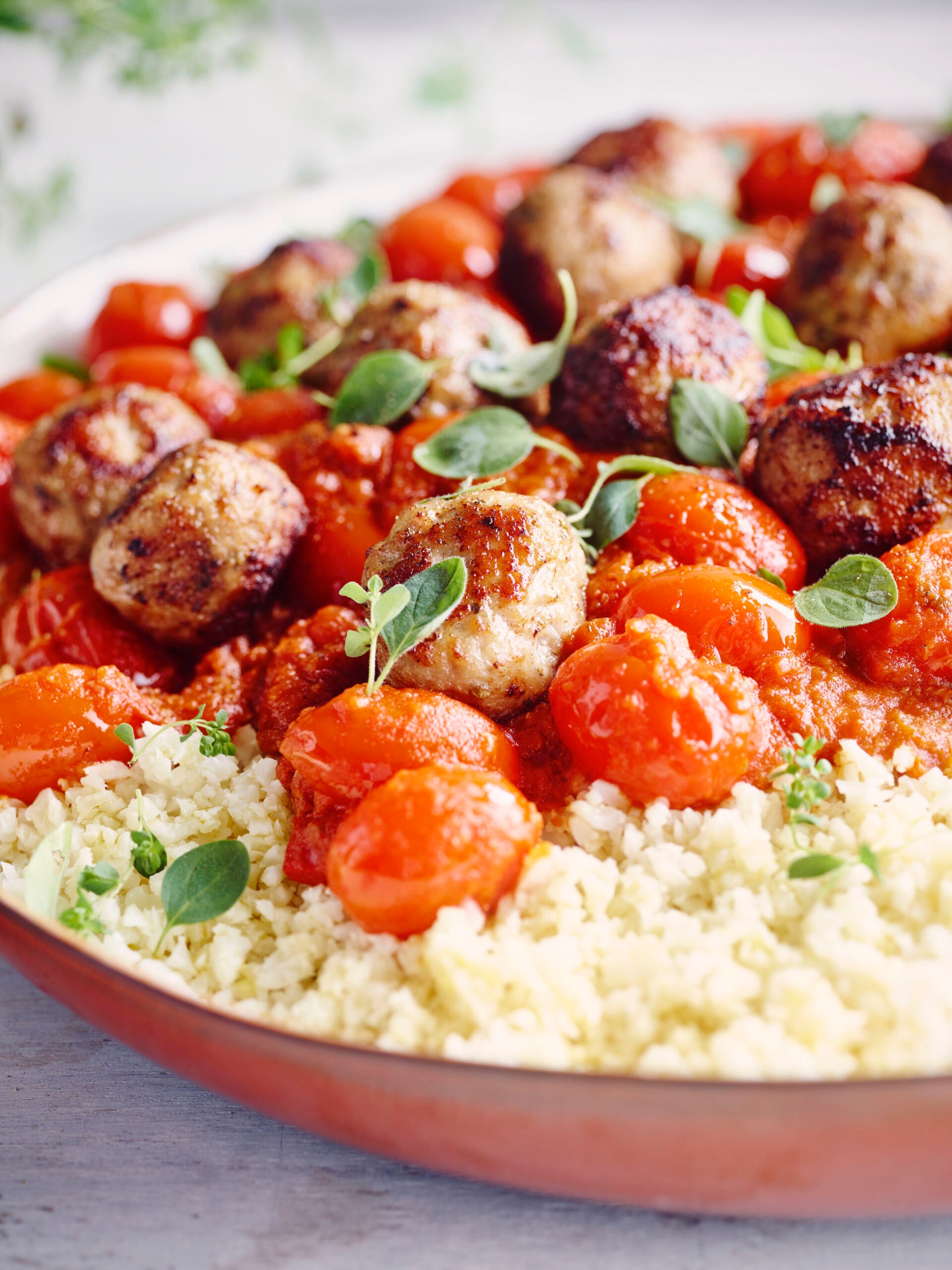 Cauliflower rice with roasted tomatoes and meatballs (and an organized fridge)