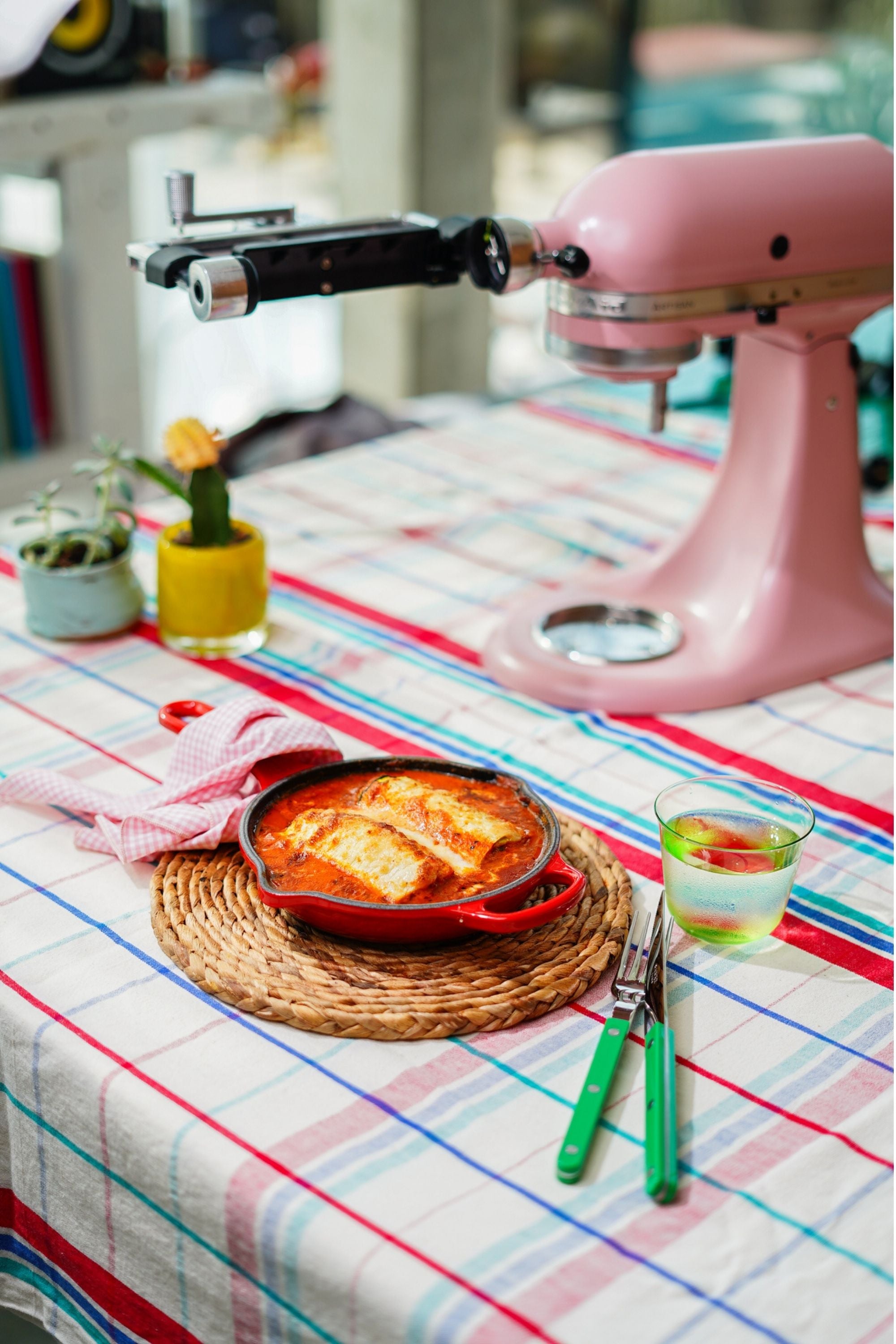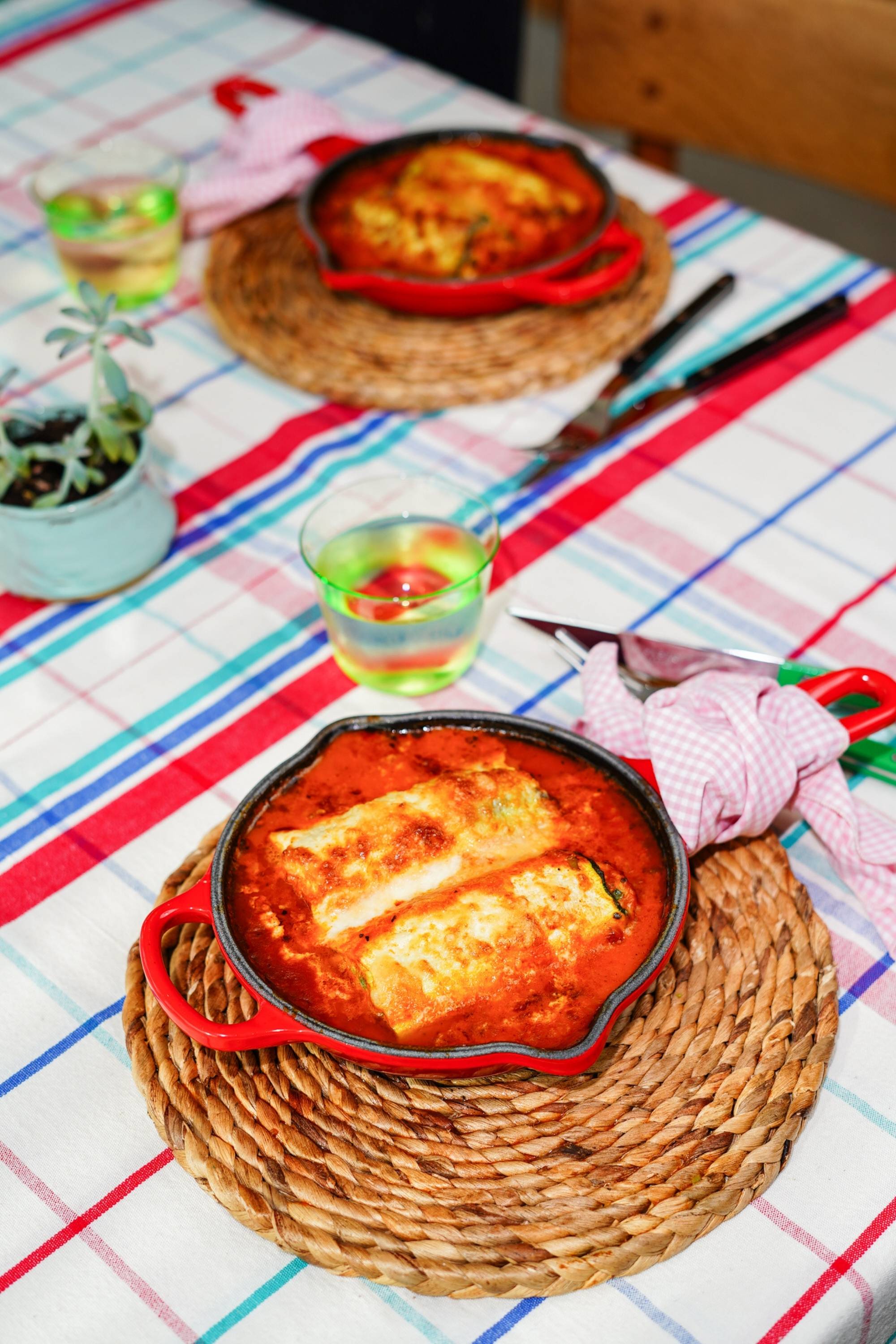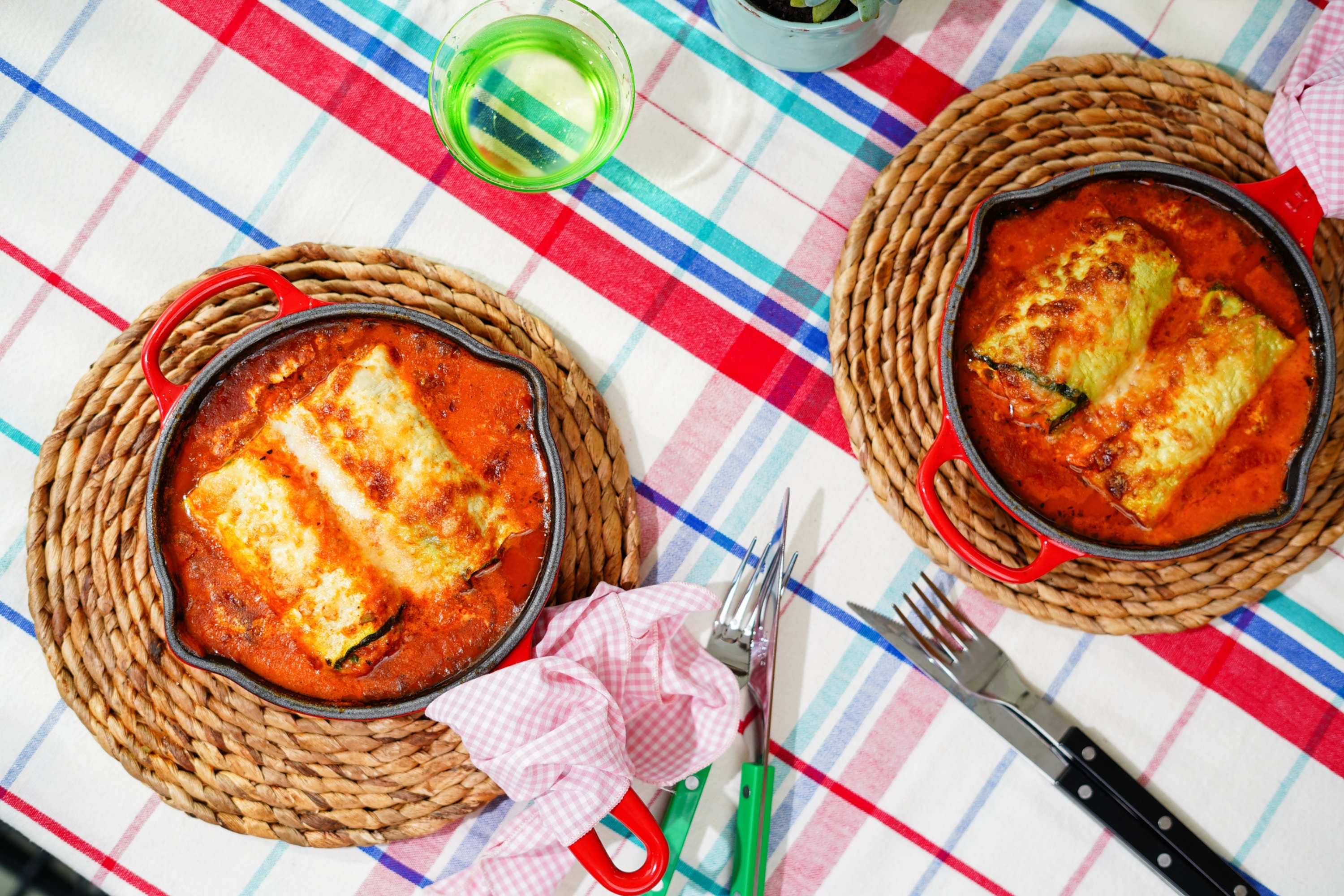 Courgette cannelloni with minced chicken, ricotta and tomato sauce