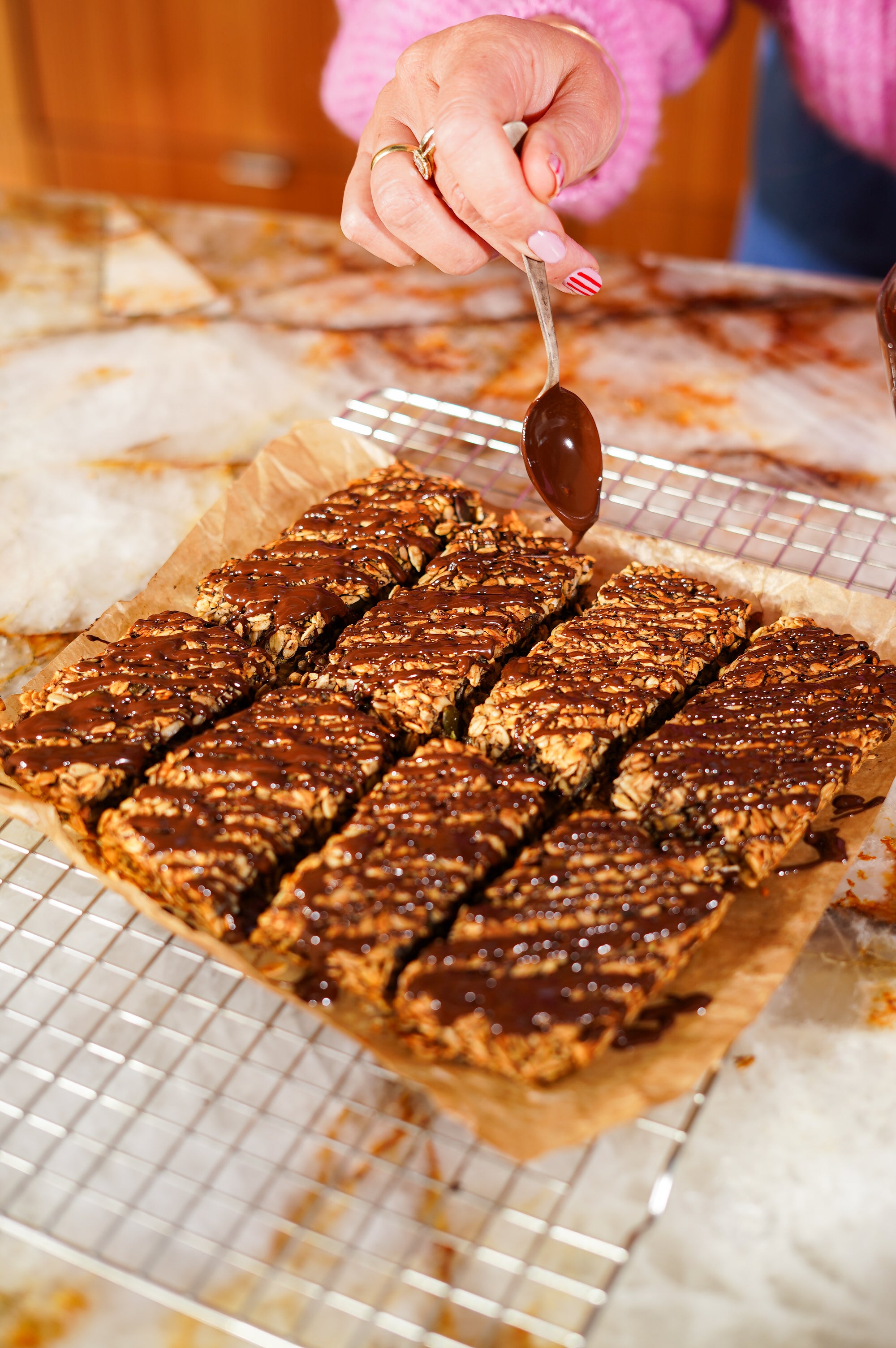 - Let the granola cool completely before cutting.