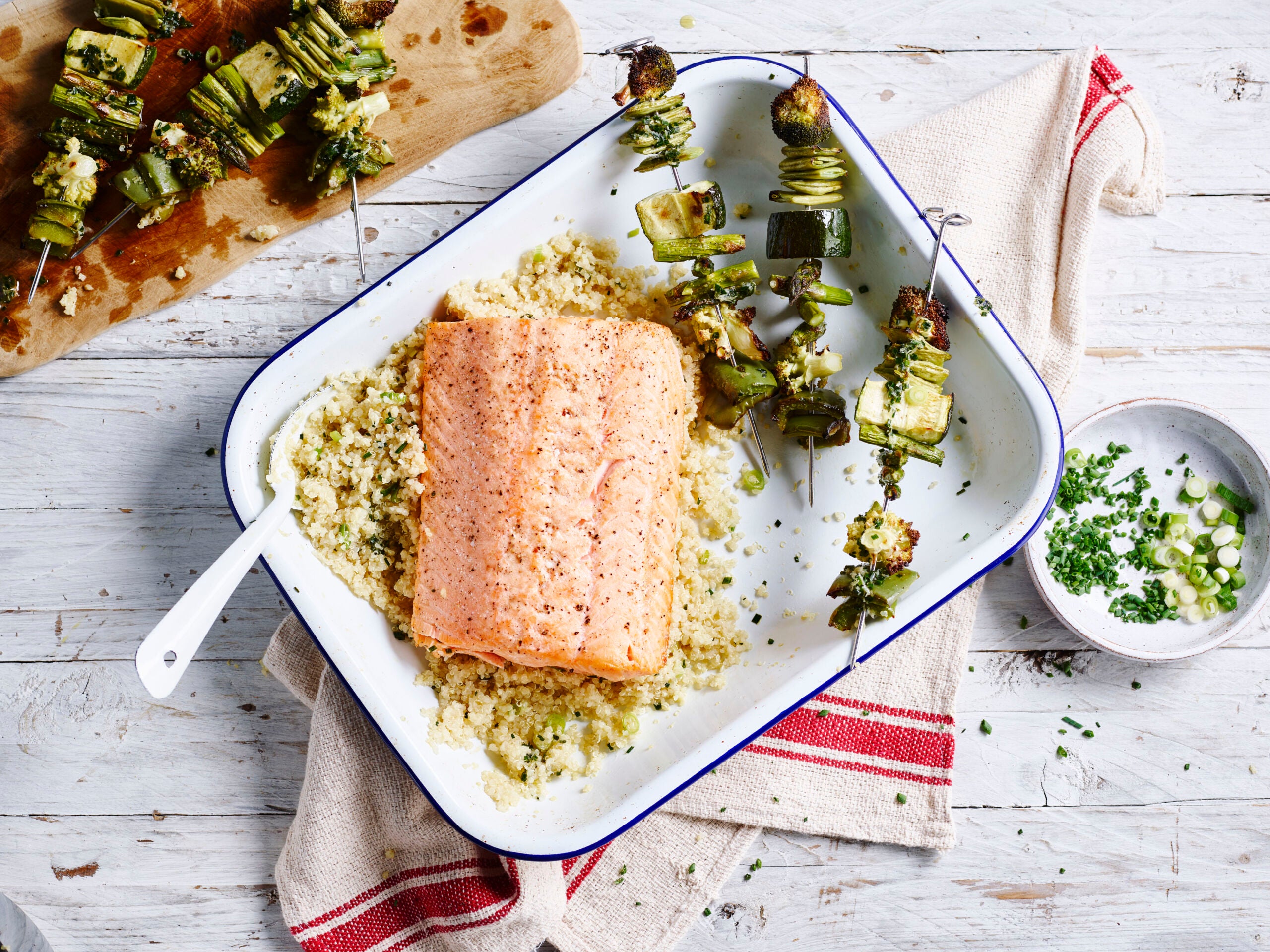 Quinoa with vegetable skewers, baked salmon, and lemongrass vinaigrette