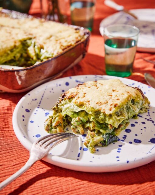 Layer in a baking dish with the fresh lasagna sheets, sautéed chicken, mushrooms, half of the sautéed spinach, and the spinach-Parmesan sauce.