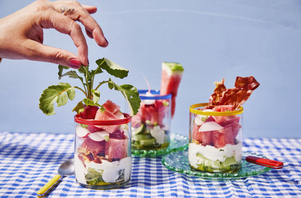 Cut the watermelon into cubes, remove the seeds, and distribute them in the glasses along with the radishes, drizzle again with some olive oil and the rest of the spring onion.