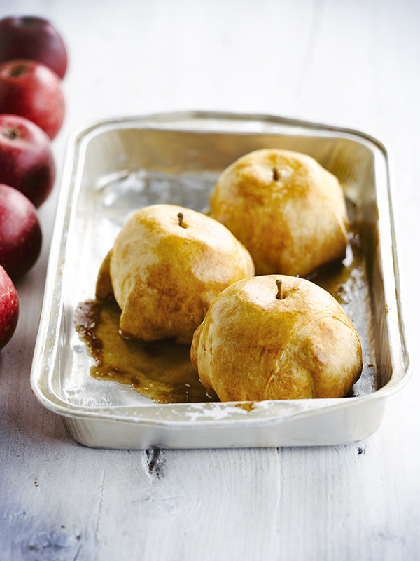 Beat the egg yolk with the milk and brush each apple with the mixture for a shiny crust.