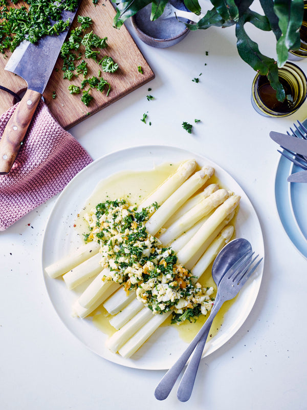 Season well with nutmeg, pepper from the mill, and salt and serve over the asparagus.