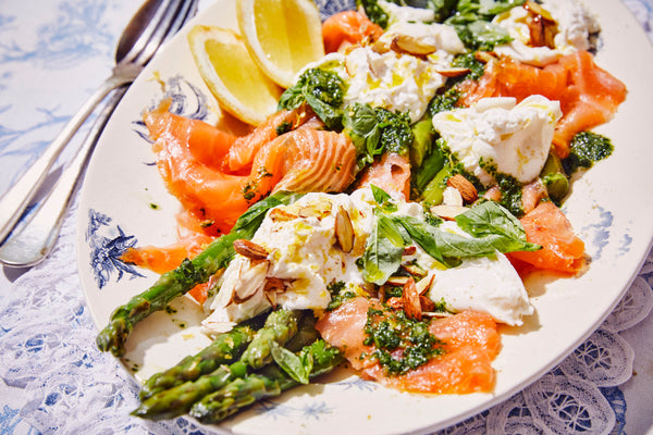 Arrange the salmon in rosettes on the asparagus, tear the burrata into pieces and place it next to it. Season the burrata with pepper and salt, finish with the sliced almonds, the basil leaves, and finally the vinaigrette, just before serving.