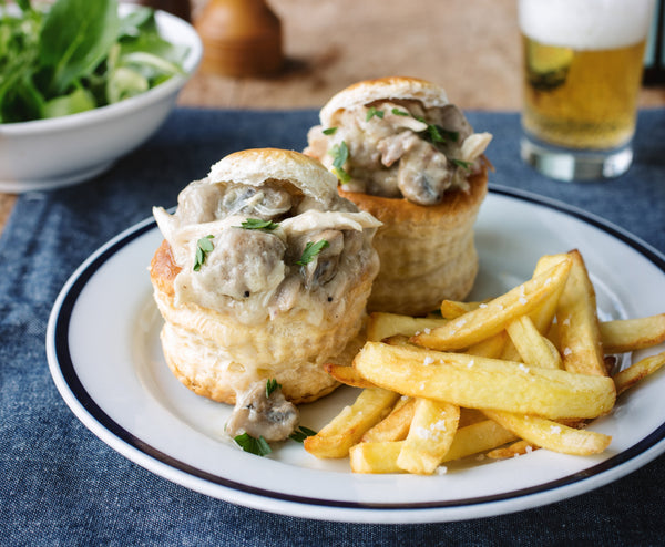 Fill the puff pastry cases with the vol-au-vent, place the lid on top, and serve with the fries.