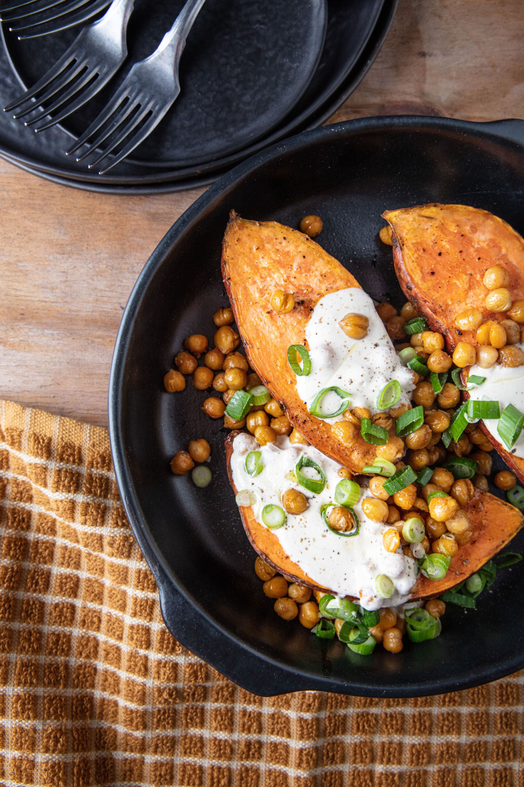 Baked sweet potato with crispy chickpeas and yogurt dressing
