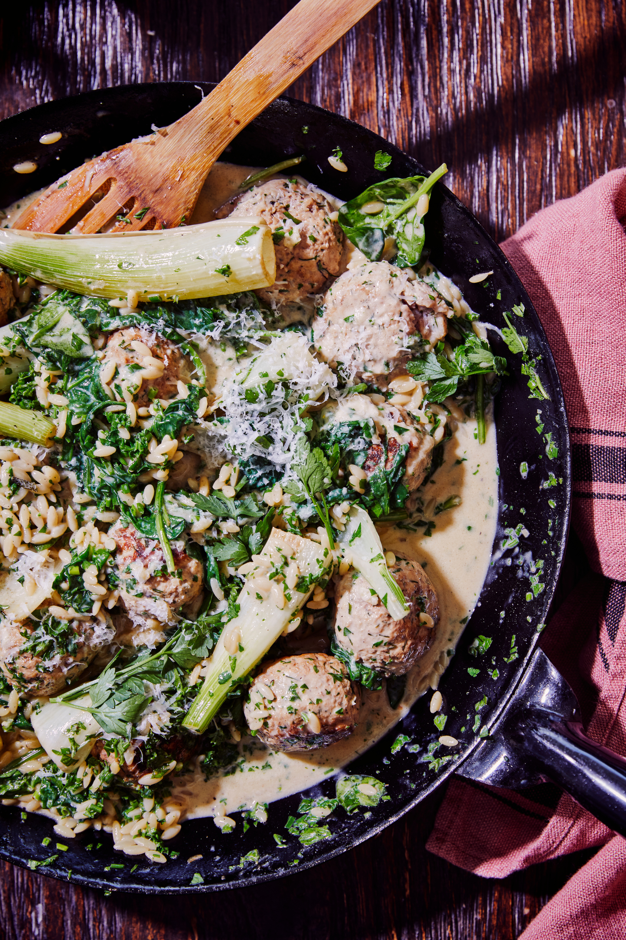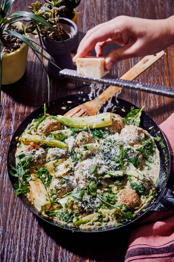 Meatballs with fennel, spinach, orzo, and Parmesan