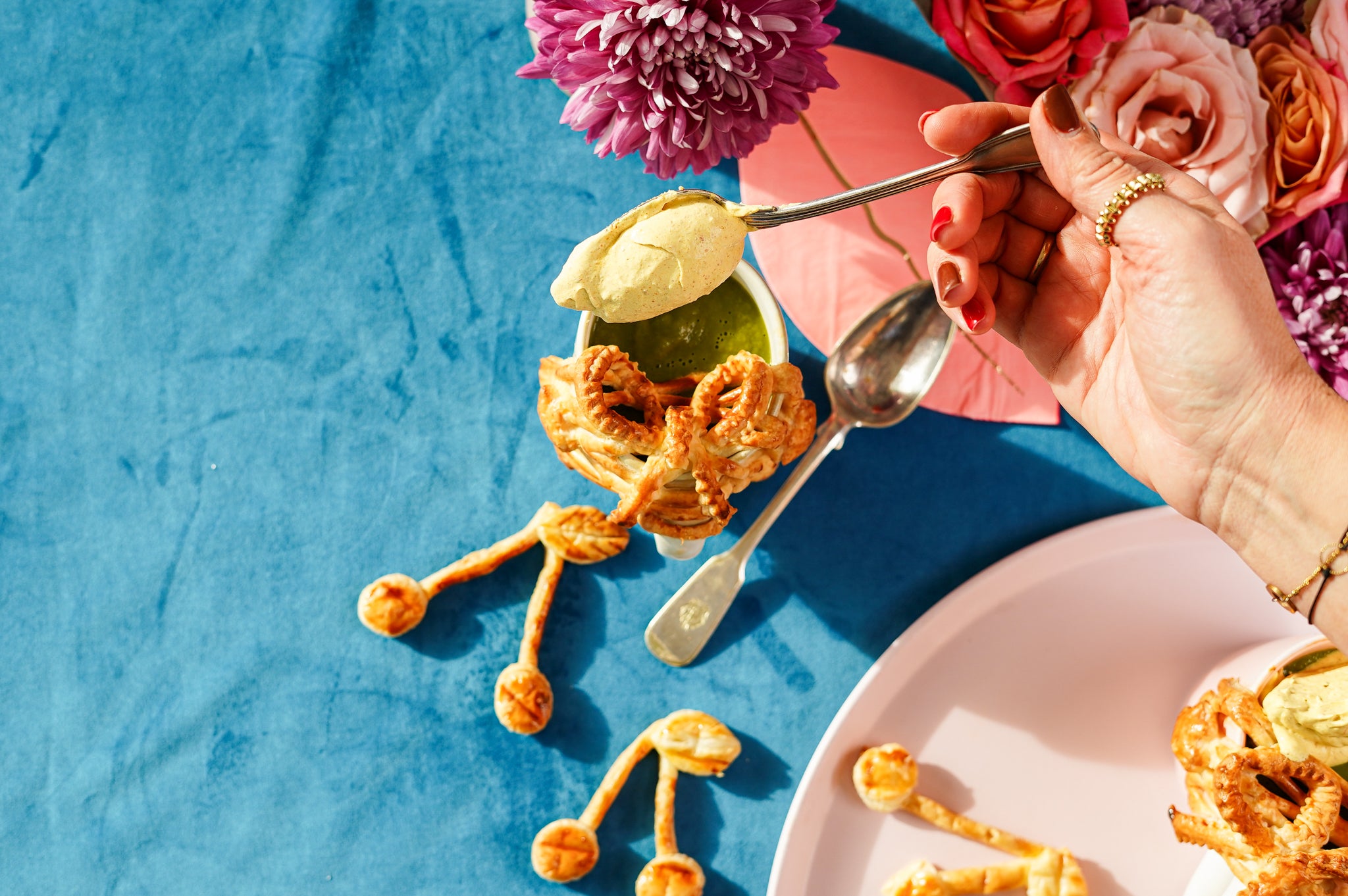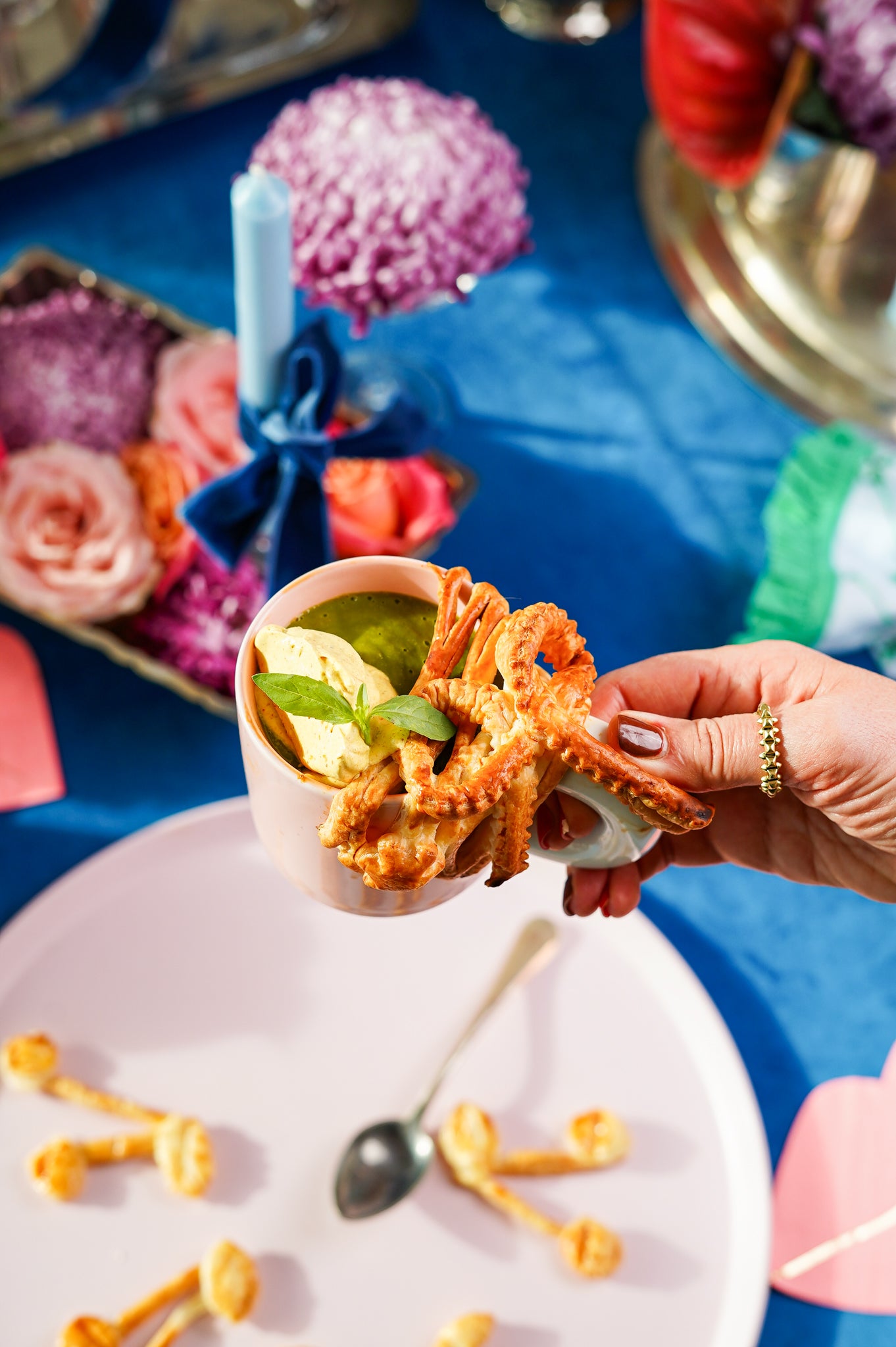 Serving: Reheat the soup. Pour into the decorated cups, finish with a spoonful of curry cream, and serve with the puff pastry ribbons for dipping.