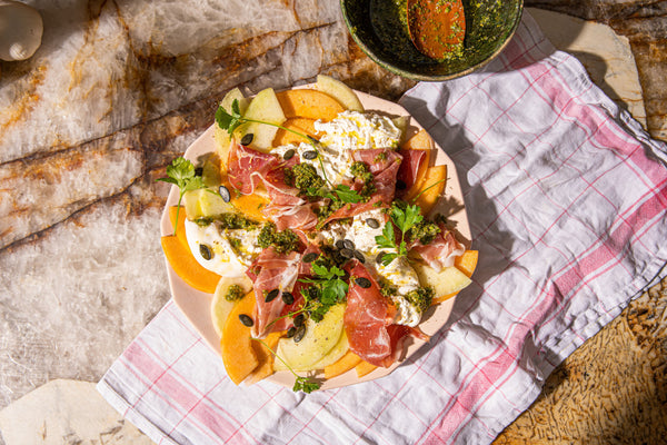 Burrata, parma ham, melon, and gremolata