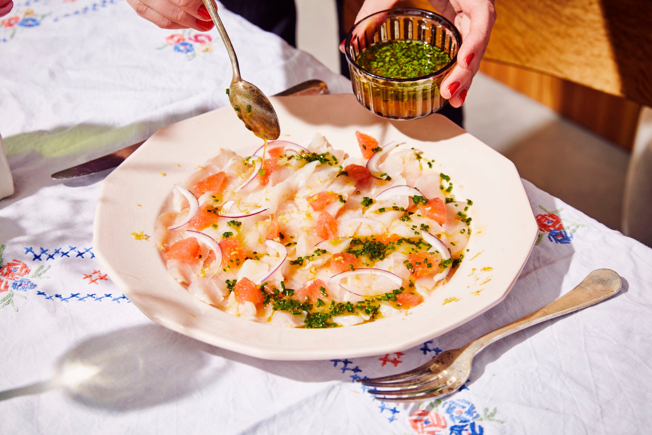 Put everything for the vinaigrette in a bowl, cut the chives into super fine rings, and stir them in. Taste and season with pepper and salt. Distribute the grapefruit segments and the onion over the sea bass, put it back in the refrigerator if you are not serving it immediately, as the citrus will start to cook the fish and it will become tougher. Just before serving, drizzle the whole thing with the vinaigrette. Optionally serve with toasted slices of bread.