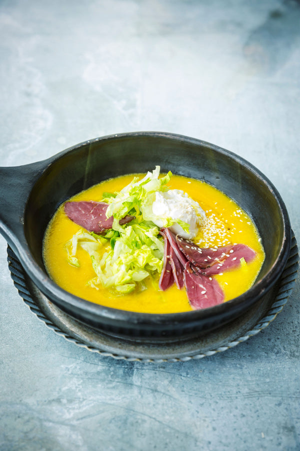 Finely chop the head of lettuce. Finish the soup with the lettuce, duck breast, and poached egg. Drizzle with sesame seeds and olive oil.
