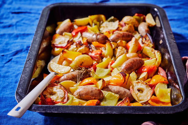 Press the sausage in the middle between your thumb and index finger and twist it around itself to form smaller sausages, cut them with scissors. Distribute everything in a large baking dish.