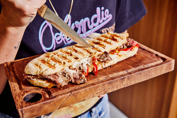 Slice the rolls lengthwise and top the 4 bottom halves with half of the cheese. Distribute the onion-pepper mixture on top. Cut the meat into thin strips, distribute it on the rolls, sprinkle the rest of the cheese over it, and place the tops on. Grill for 5 minutes until the roll is toasted and the cheese is melted. Serve on a board with a steak knife and eat immediately!