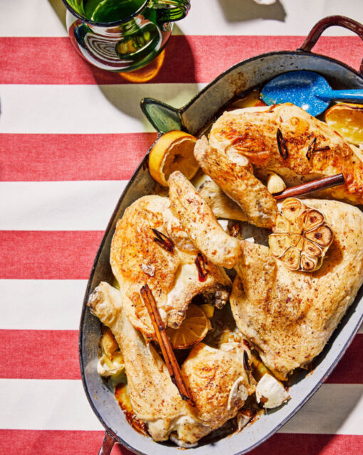 Make a mixture of the lemon zest, finely chopped chili pepper, cinnamon powder, olive oil, and a little salt. Mix well, cut the lemon into three pieces and place these along with a halved bulb of garlic and two cinnamon sticks on the chicken. Pour the olive oil mixture over it. Place the chicken in the oven for 40 minutes and baste regularly with the juices.
