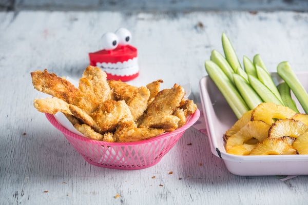 Chicken nuggets with fried pineapple and cucumber