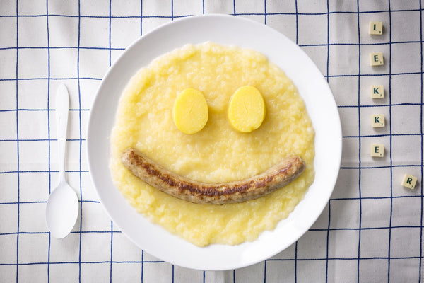 Spoon the fruit puree in a circular shape on a plate. The sausage becomes a mouth and the potatoes are eyes.
