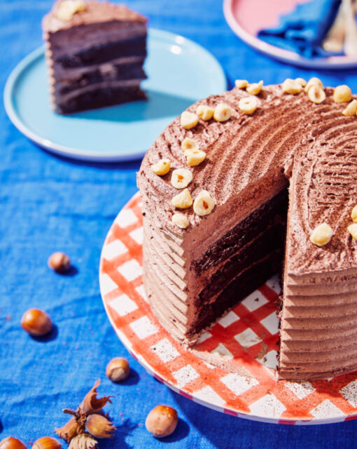 Chocolate layer cake with chocolate tahini icing