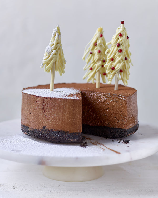 Remove the cake from the mold and dust it with cocoa. Finish it with a few pine trees and some icing sugar and serve the rest separately.