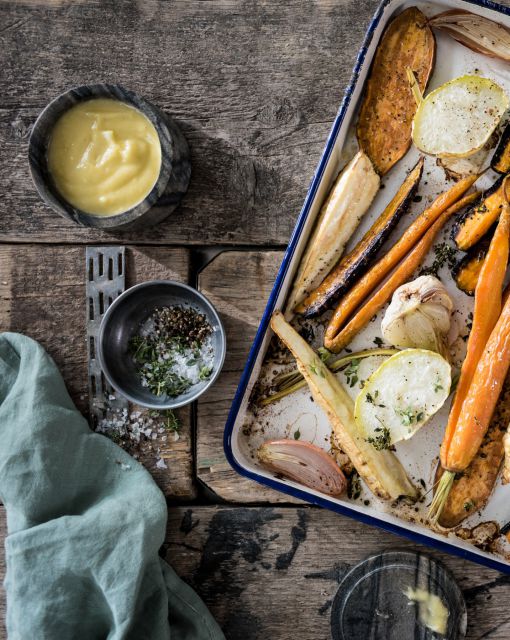 Use with ingredients as you would with classic mayonnaise. Here I serve it with warm grilled vegetables from the oven. Wash the vegetables, peel if necessary, sprinkle with pepper, sea salt, thyme, garlic, shallot, mix well, spread everything side by side on a baking sheet lined with parchment paper, roast for 20 min at 190°C in the oven, done!