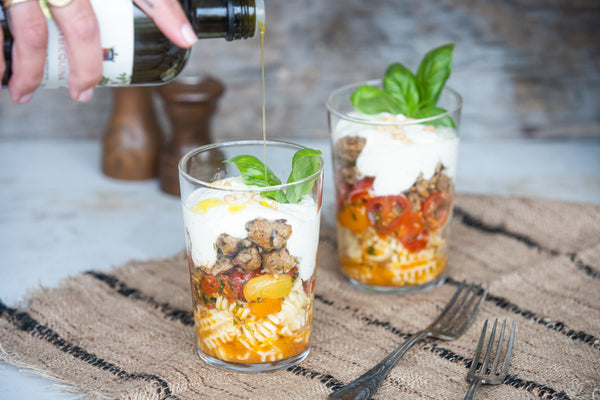 Divide the pasta, tomatoes, and fried sausage into large glasses. Top with the whipped mozzarella. Finish with pine nuts and basil leaves.