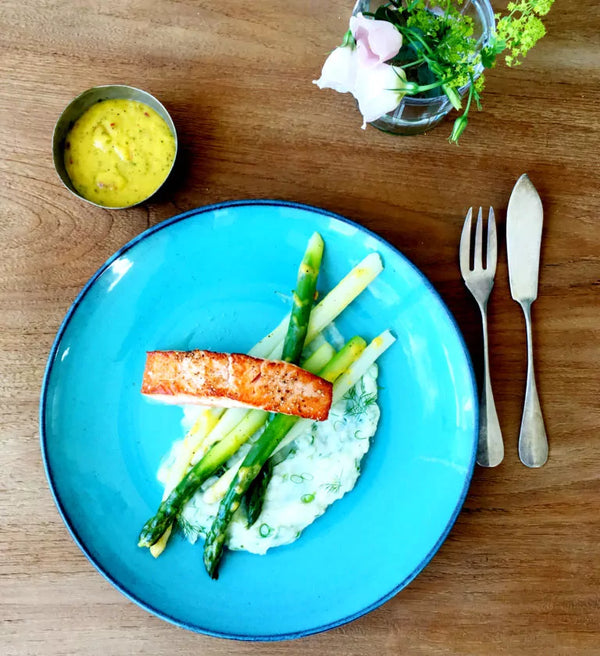 Crispy salmon with asparagus, spicy mango dressing, and potato mousseline
