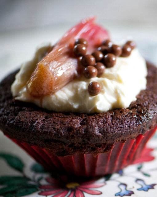 Decorating: Garnish the cupcakes with chocolate pearls and a spoonful of rhubarb compote. Serve and enjoy!