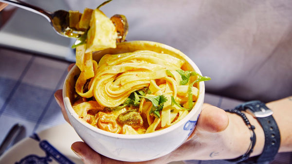 Then take a deep bowl to serve your dish. Place the noodles at the bottom and add the pieces of silken tofu directly from the package into the bowl with a spoon. Add the broth and then place the shiitake on top. Finish with sesame seeds, spring onion, and coriander.