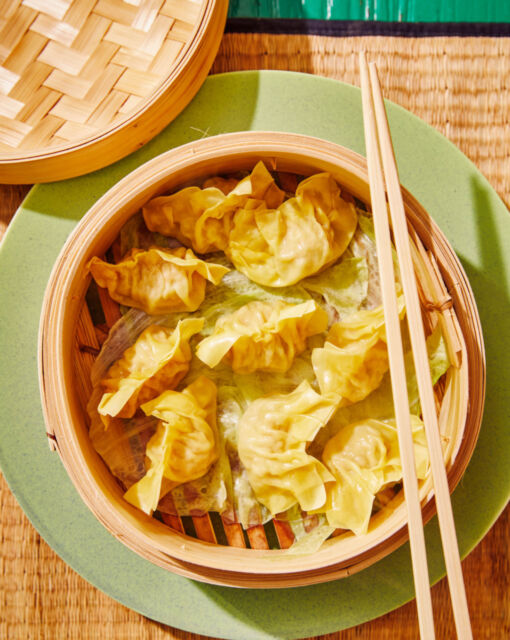 Steaming the dim sums: Line a steamer basket with a leaf of Belgian endive to prevent sticking. Place the dim sums apart in the basket and steam them for about 5 minutes until cooked.