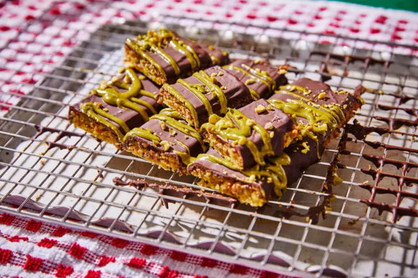 You can easily replace the pistachiorangipane with marzipan or a nut mixture, depending on your preference. Always keep the bar in the fridge to keep the chocolate nice and crispy.
