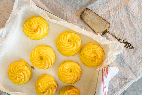 Peel the potatoes and steam them until cooked, push them through a potato ricer into a bowl or mash very finely with a potato masher so that you have no lumps, otherwise you won't be able to pipe nice towers, passing them through a sieve is also an option.