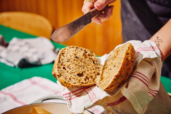 Shaping and baking: Prepare baking paper and sprinkle it with sesame seeds. Pour the dough (in one piece or divided into six portions) onto the baking paper. Remove the hot cast iron pot from the oven. Place the ice cubes in the pot, then place the baking paper with the dough in the pot, and close immediately with the lid.