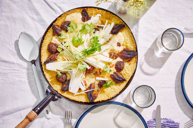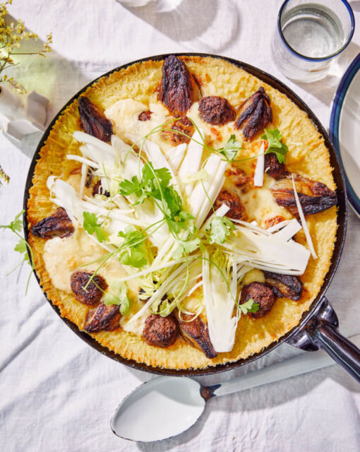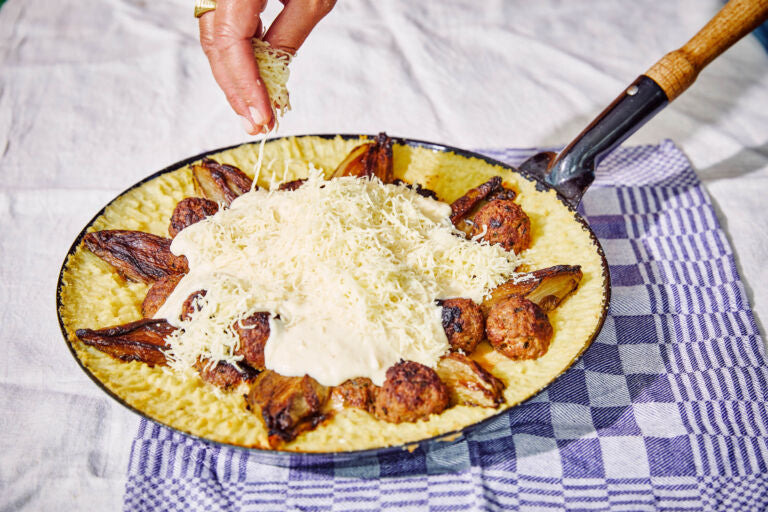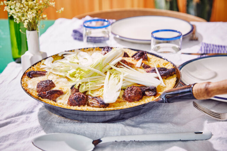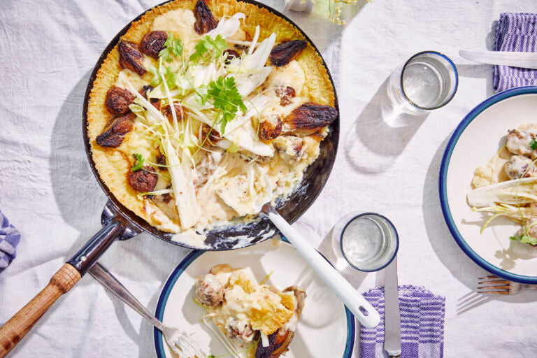 Chicory with cheese sauce, meatballs, and mashed potatoes