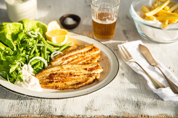 Let a large chunk of butter melt in a non-stick pan and fry the soles on both sides until beautifully golden brown.