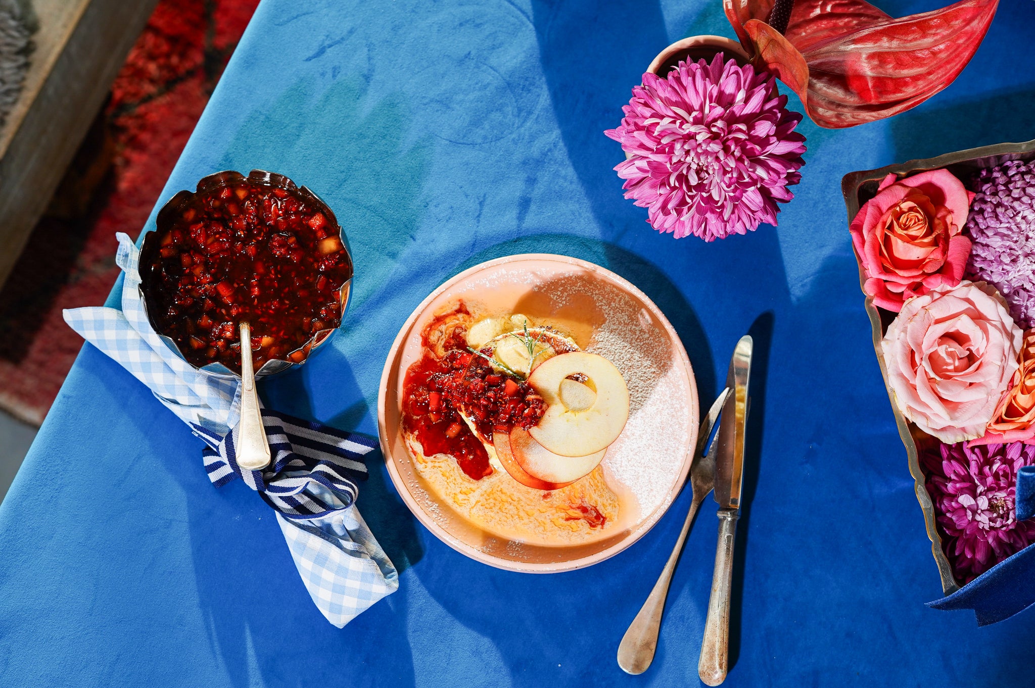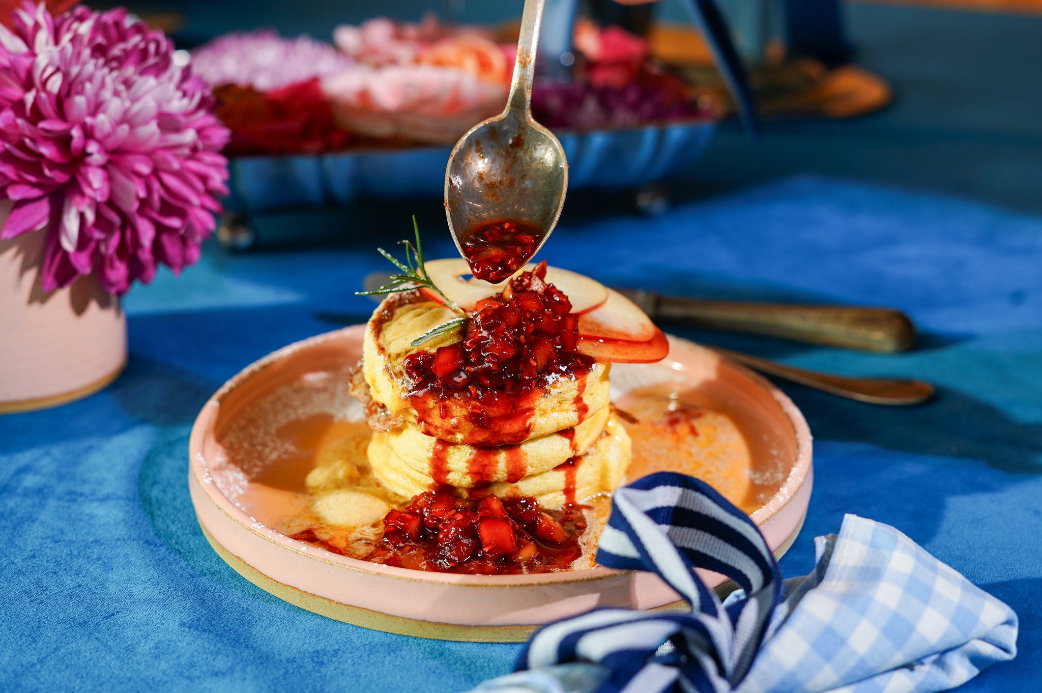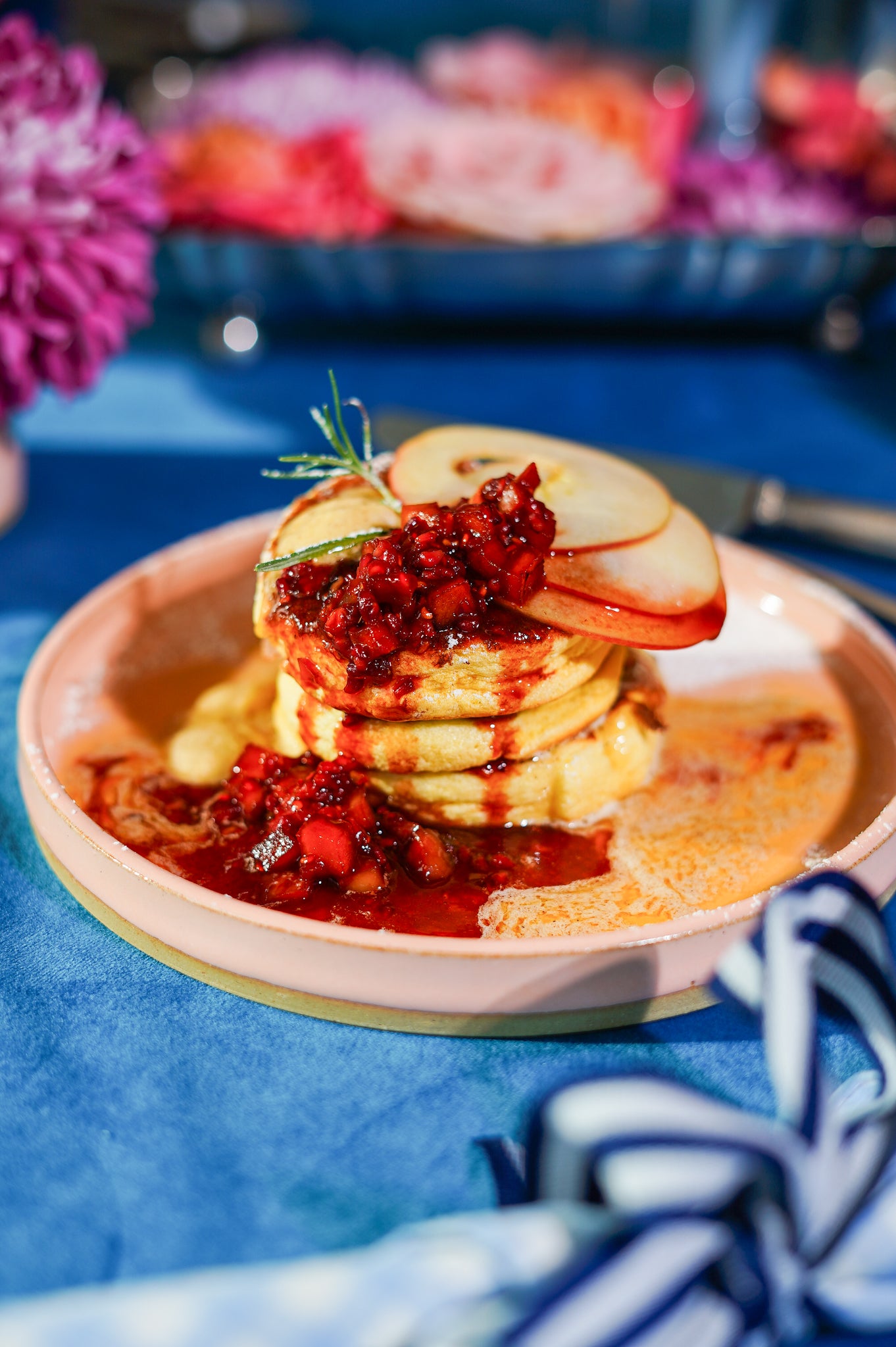 Finishing touches: Stack the pancakes with a dollop of honey butter in between. Finish with warm apple raspberry caramel and thin apple slices on top, and optionally some powdered sugar.