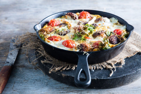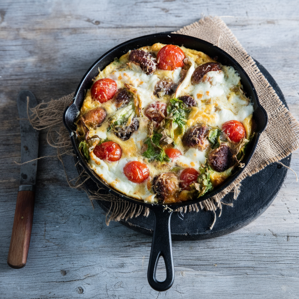Beat the eggs with pepper and salt and pour them into a warm pan. Now distribute the meatballs with the mixture over it, finish with the cheeses, and let it sit on the heat for 2 minutes. Then place the pan in an oven at 220°C for another 5 minutes.