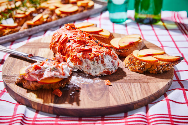 Goat cheese roll with Chorizo on Crostini with Nectarines and Chili-Ginger Pickle