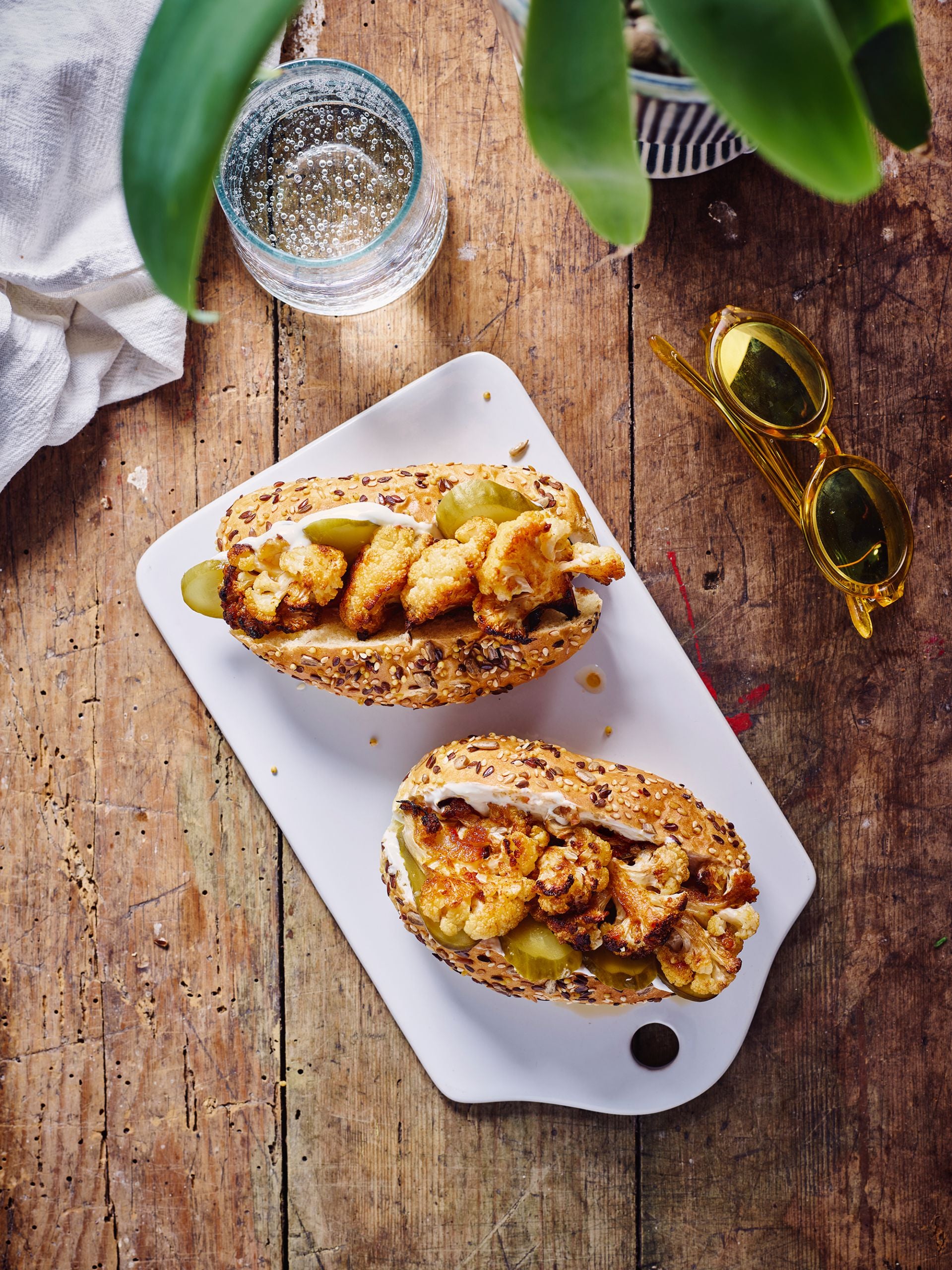 Grilled cauliflower rolls Buffalo style with yogurt and pickles