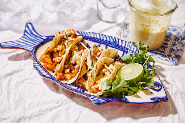 Grilled fish tacos with peach salsa and jalapeño mayo