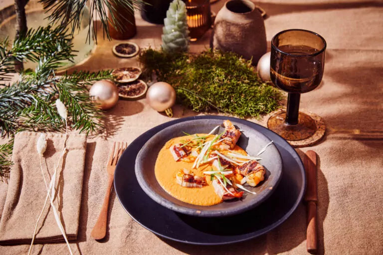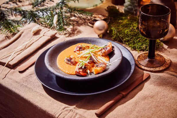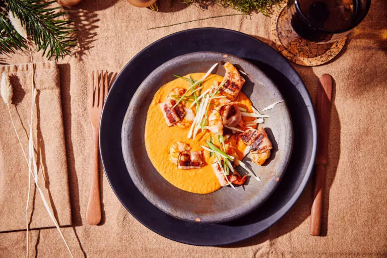 Grilled shrimp and bacon with mascarpone diabolique sauce