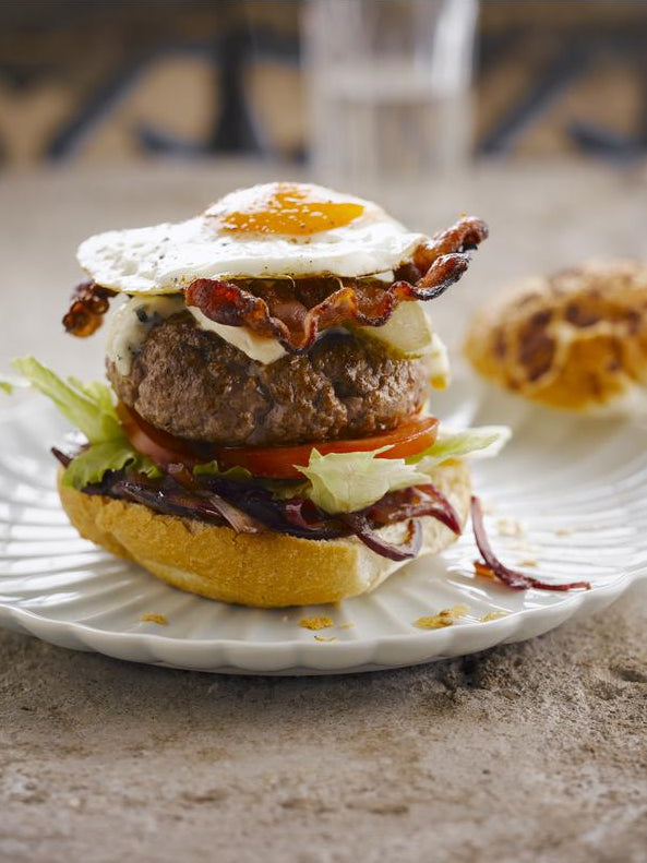 Cut the rolls open and spread them with the onion jam. Top each roll with a leaf of lettuce, a hamburger, two slices of bacon, a few slices of tomato, some slices of pickle, and a slice of blue cheese. Finish with the fried egg.