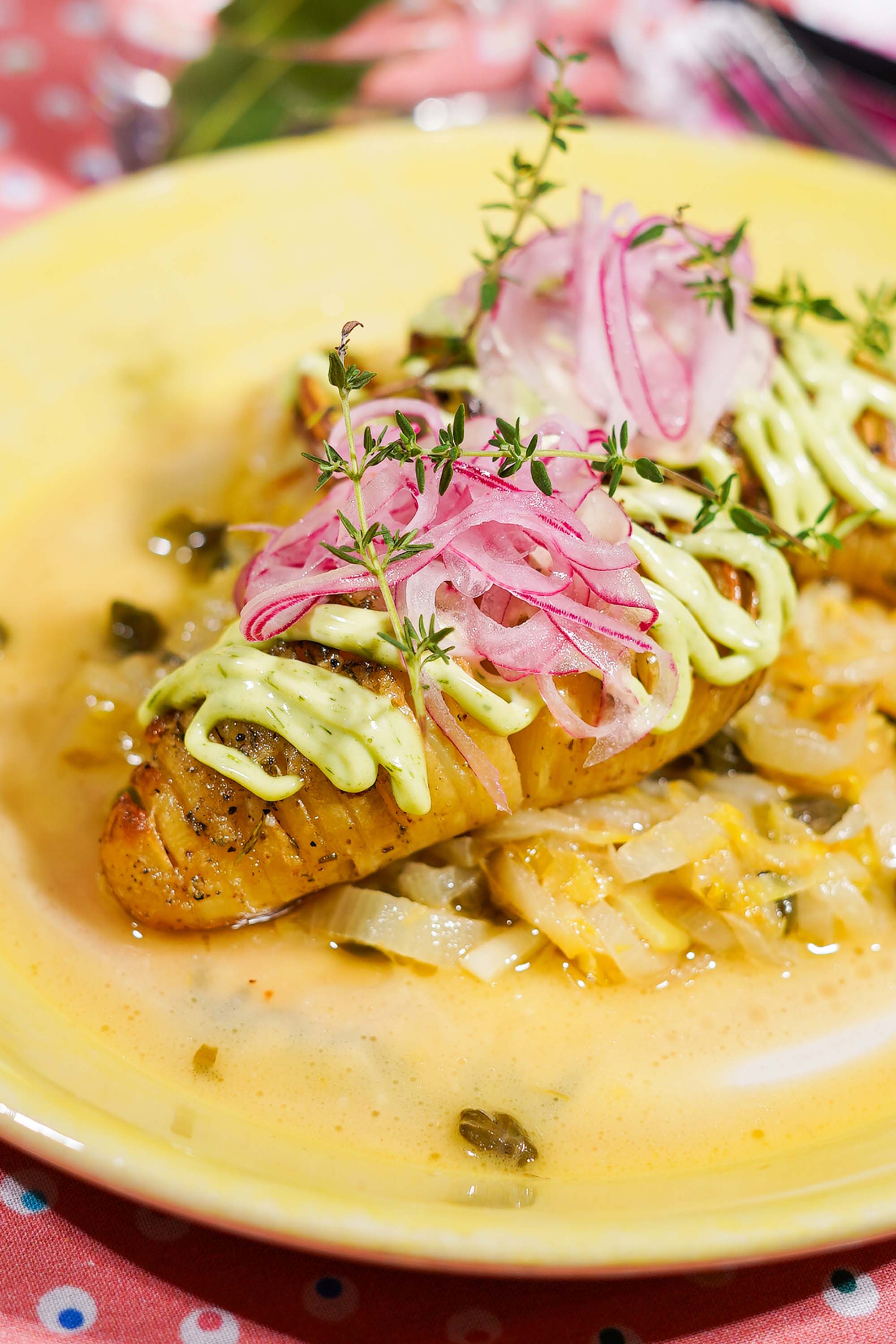 Werk af met dotjes of streepjes bieslookmayonaise, de gepekelde ui en eventueel een beetje gebruinde boter van de aardappelen errond.