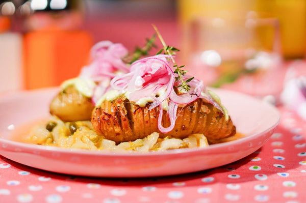 Finish with dollops or stripes of chive mayonnaise, the pickled onion, and possibly a bit of browned butter from the potatoes around.