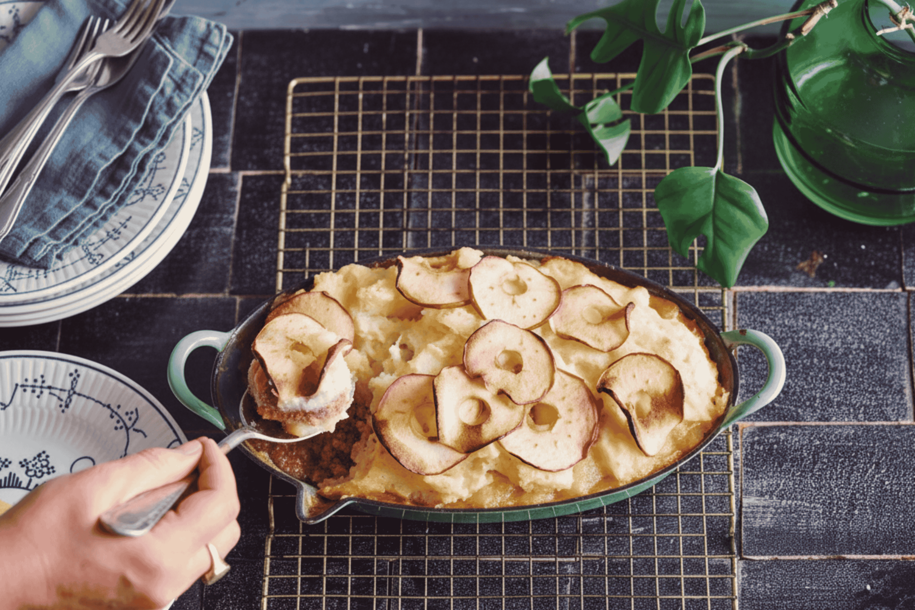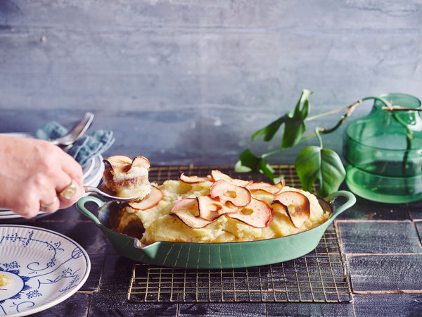 Prepare your mashed potatoes and distribute scoops over the applesauce.